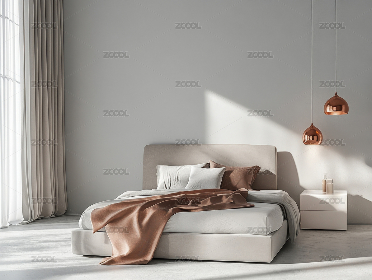 卧室,现代,简约,床,棕色,白色,吊灯,窗帘,床头柜