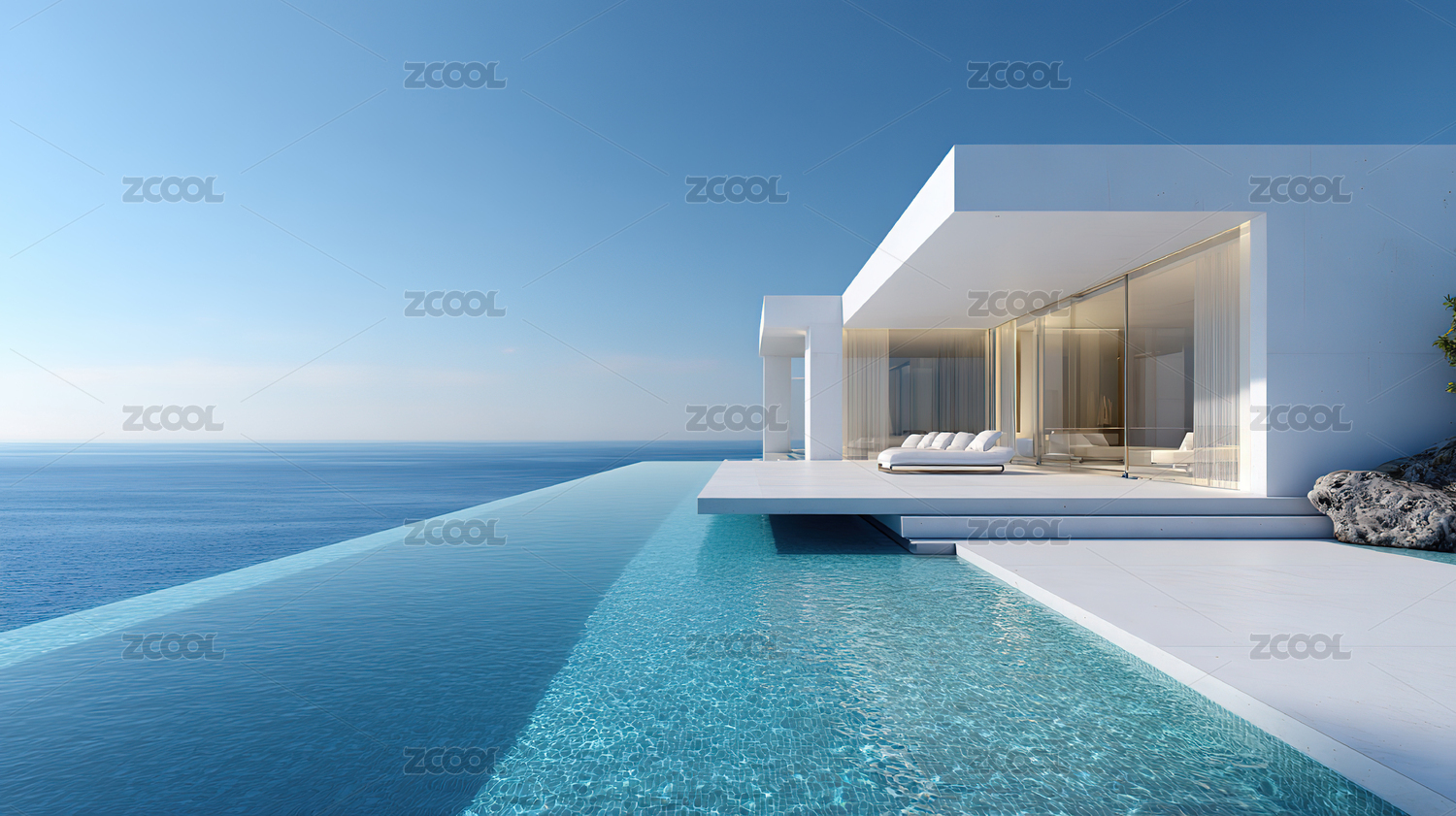 海边,现代,建筑,白色,蓝色,天空,植物,阳台,海景