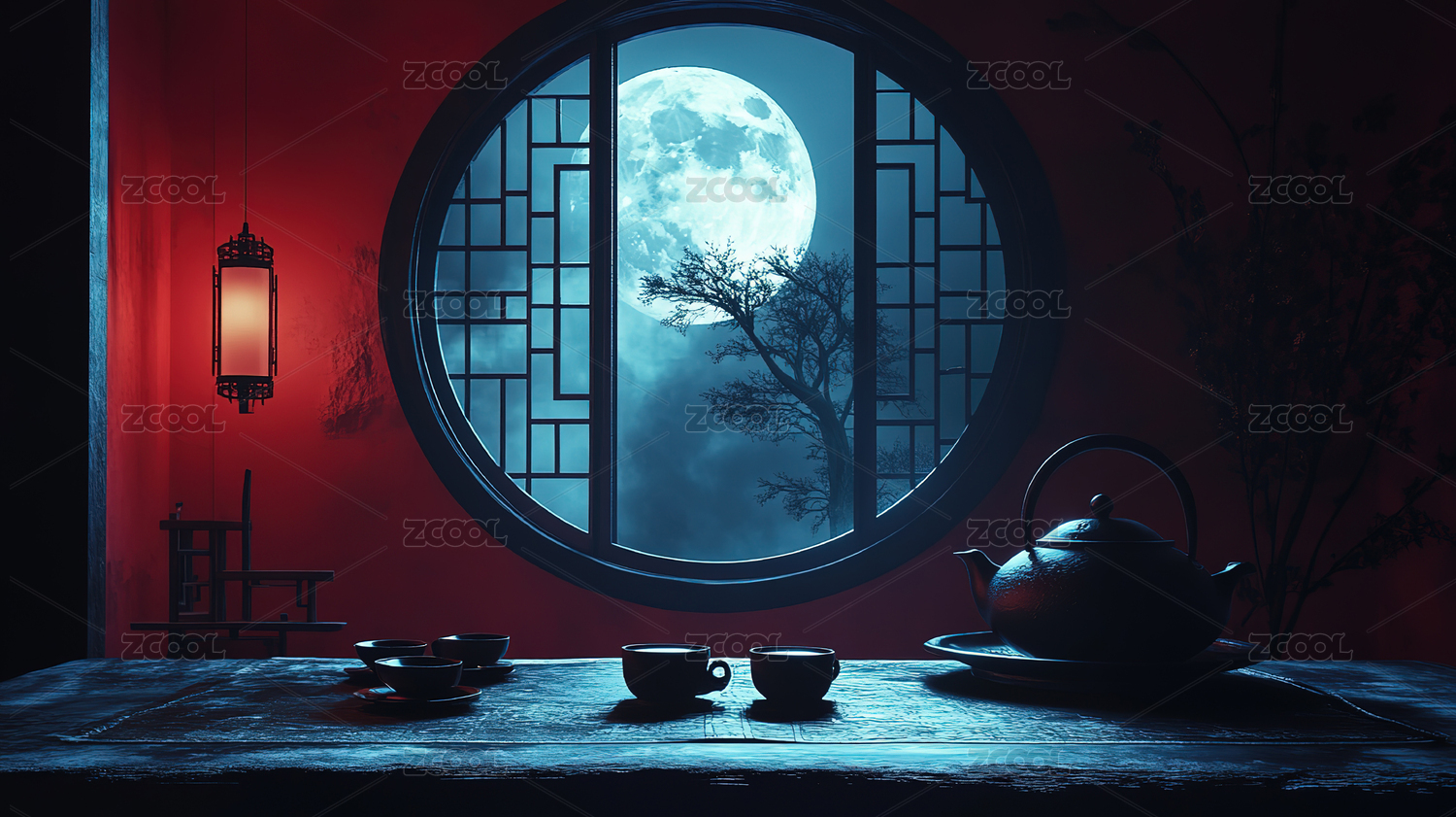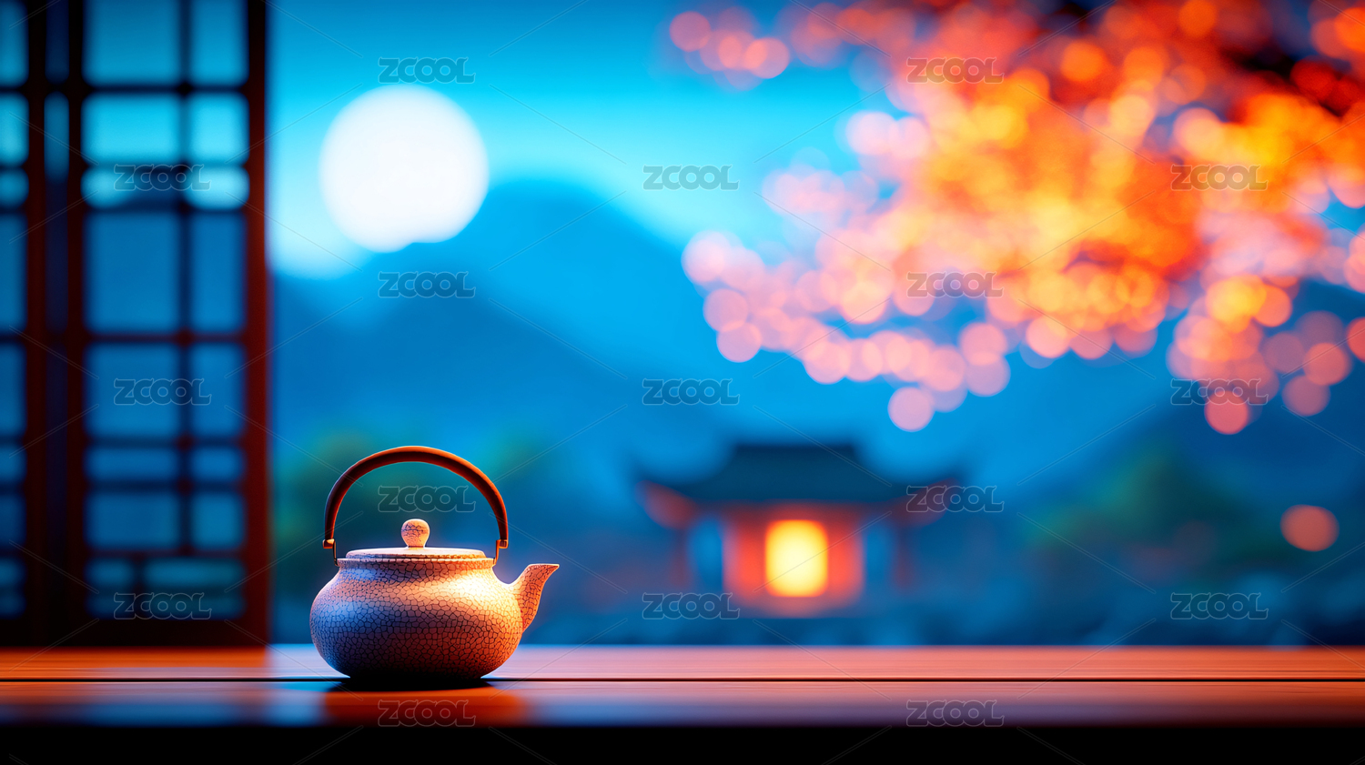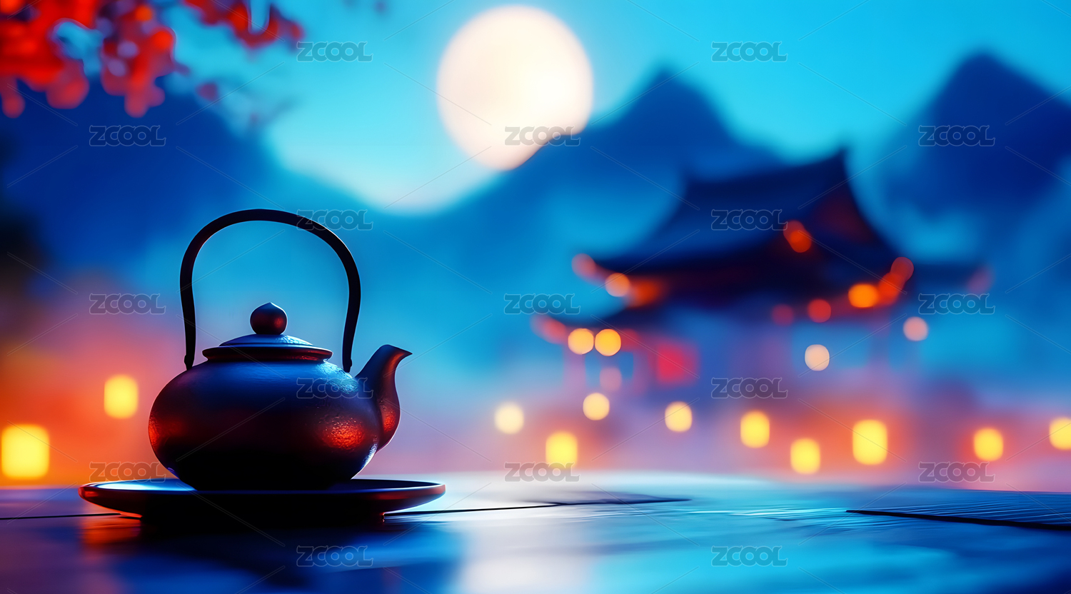 中国风, 月亮,意境, 宁静,茶壶, 茶, 山, 夜晚, 夜景, 灯笼
