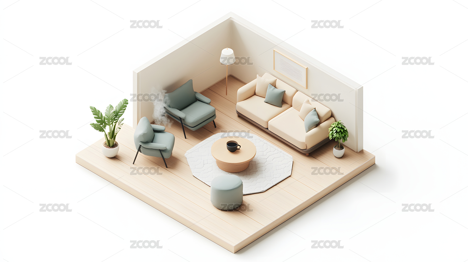 暖色客厅装修俯视立体轴测图3D卡通插画