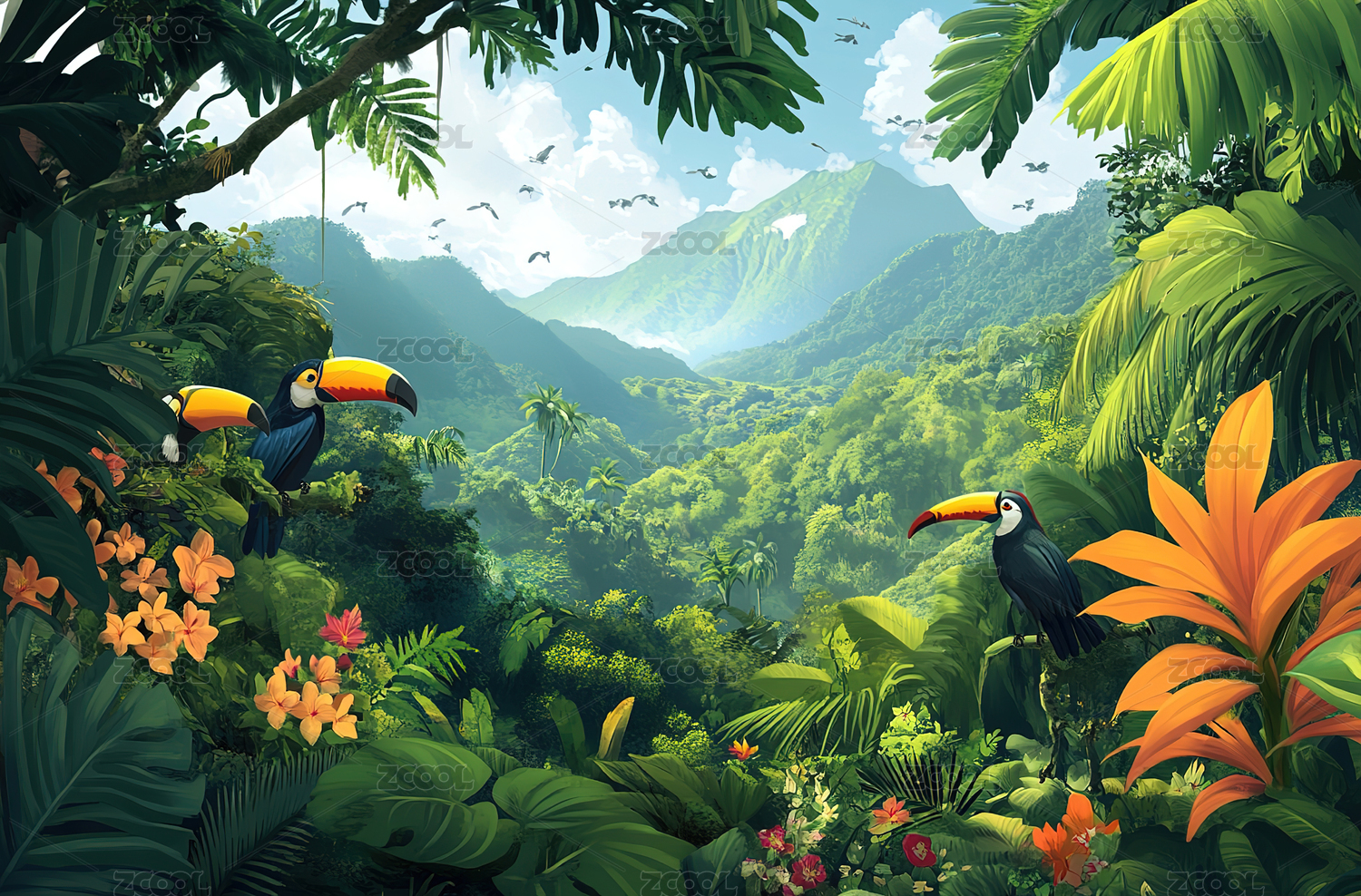 热带雨林,色彩斑斓,飞翔的鸟儿,茂密的树木,鲜艳的花朵。