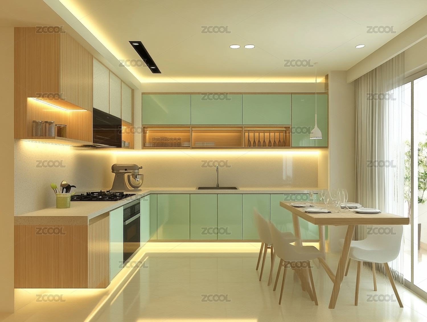 厨房,橱柜,吊灯,大理石台面,绿松,石色,现代,简约,室内,设计