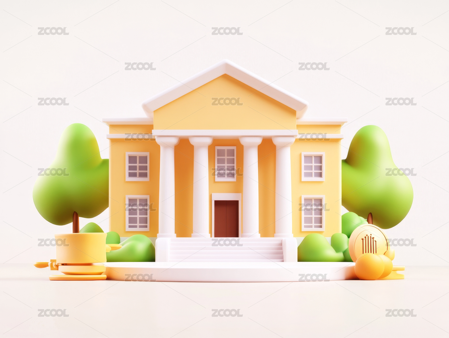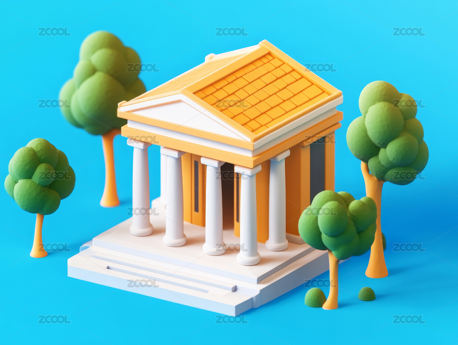 建筑,模型,卡通,黄色,柱子,树木,楼梯,绿色,屋顶,窗户