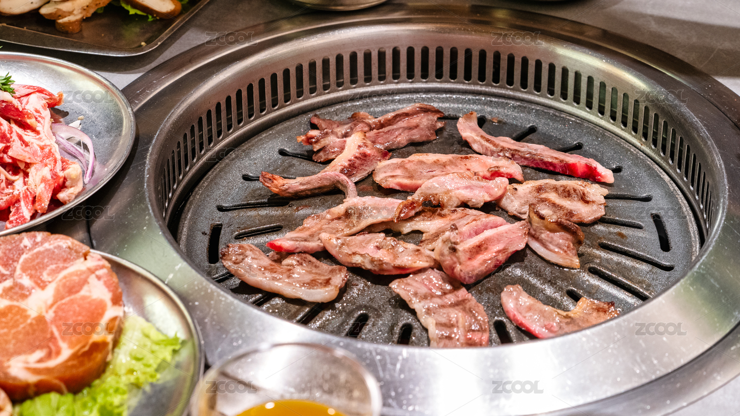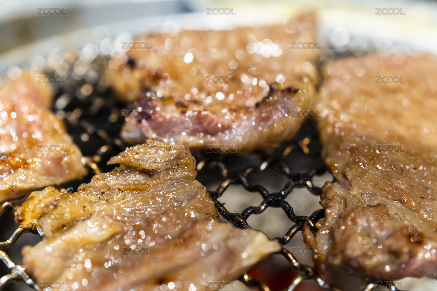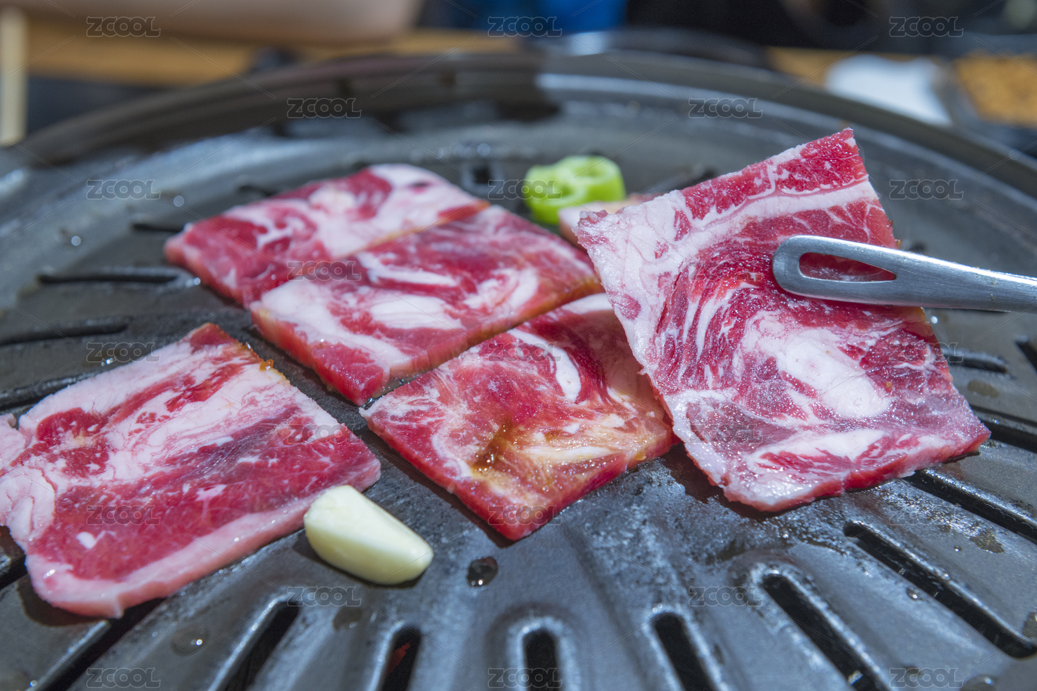 黑色炙烤盘上有一些烤冒烟的牛肉片