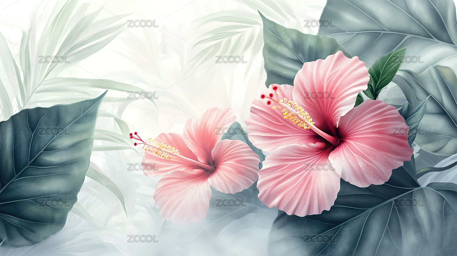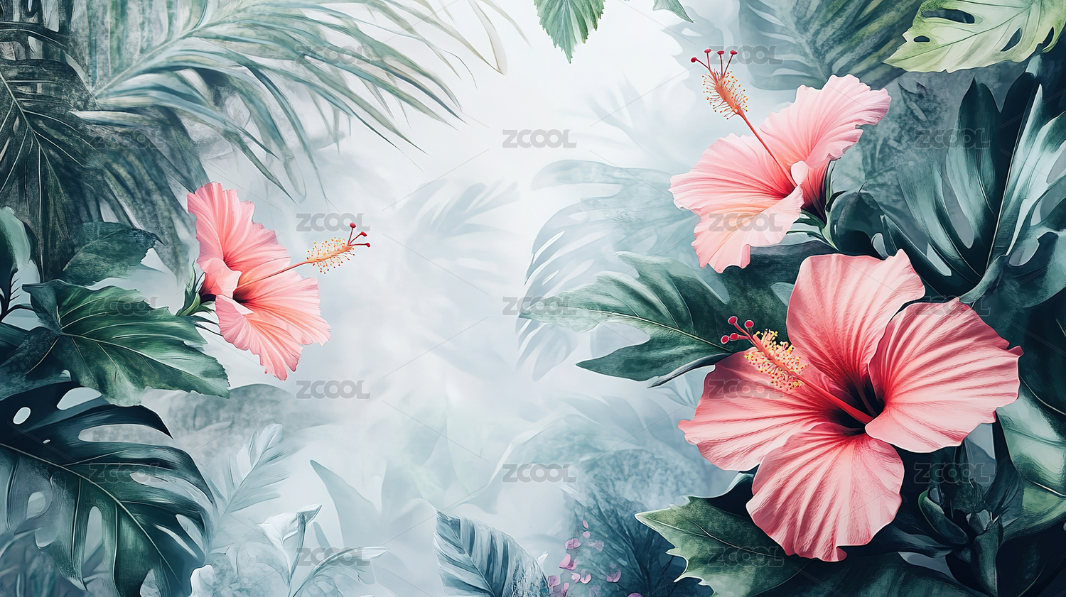 粉色花朵绿叶热带背景