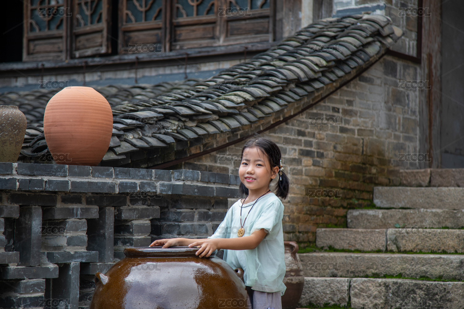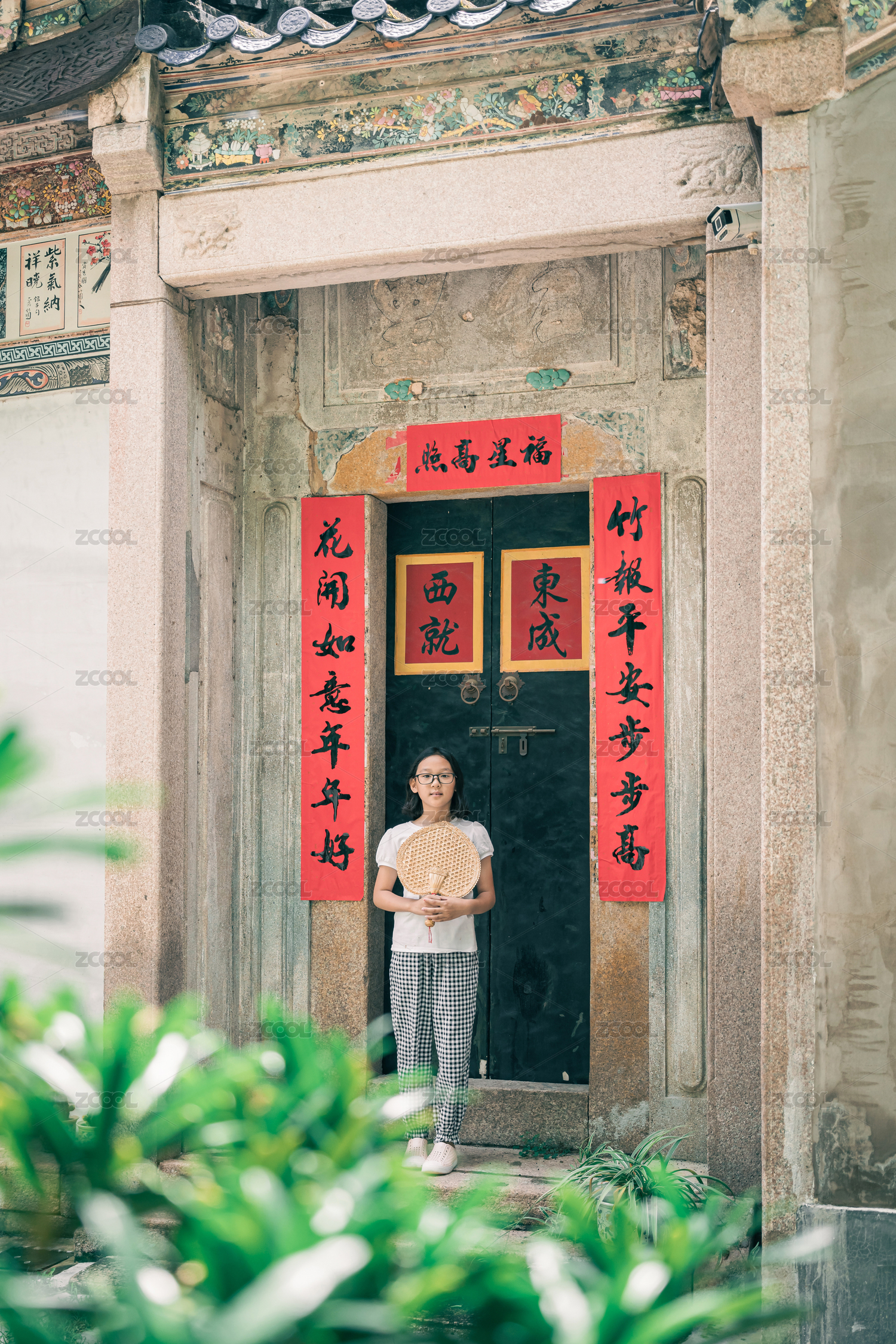 小女孩 台阶 传统建筑 门窗 石墙 庭院