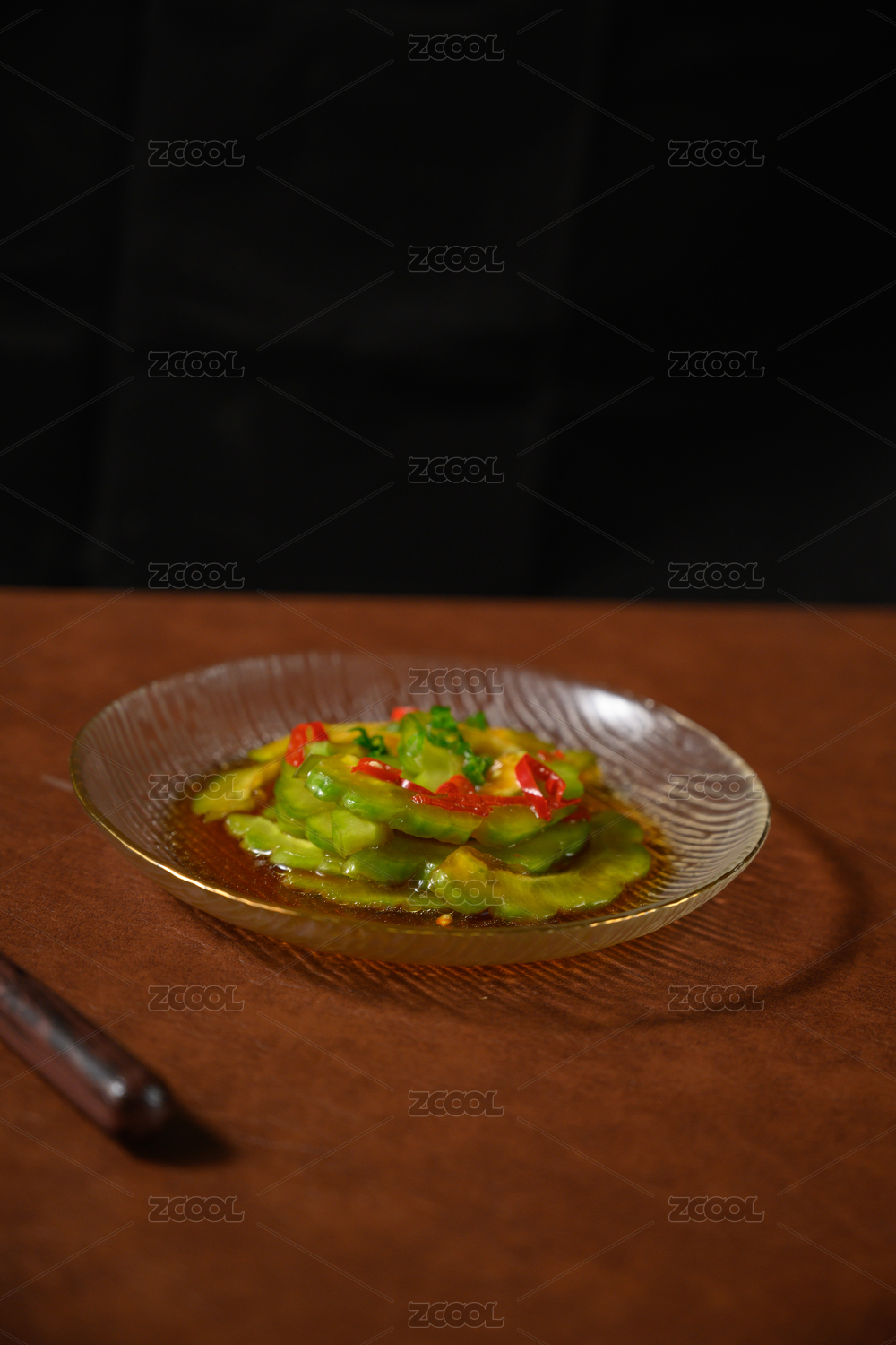 桌面上的盘子里的美味可口的凉拌苦瓜
