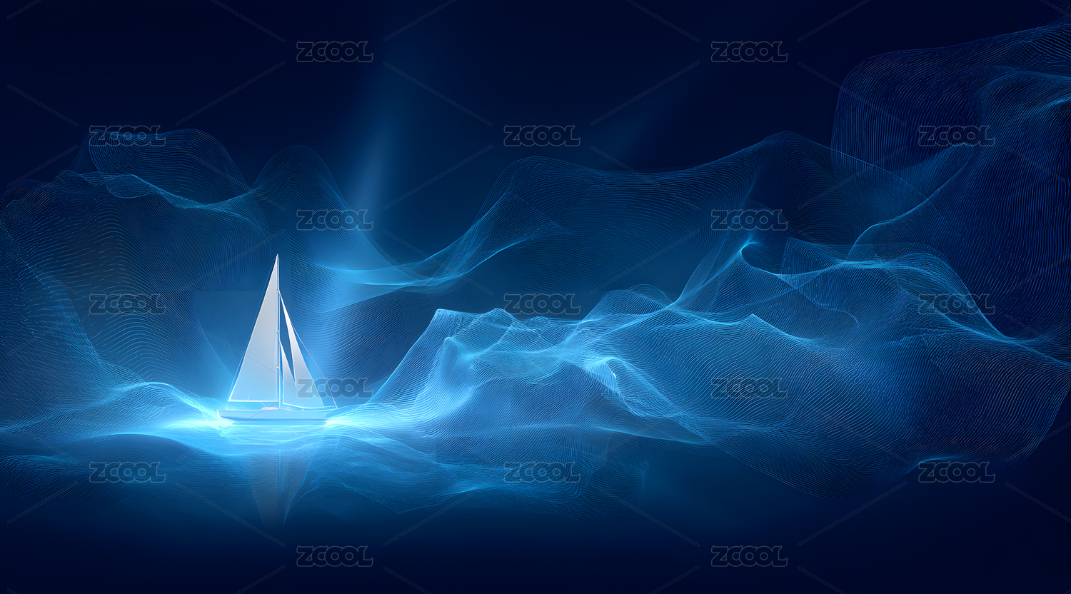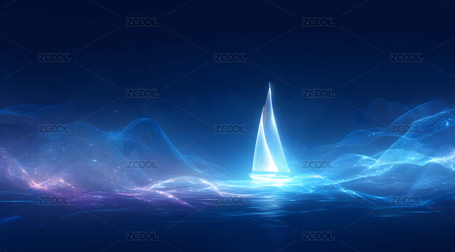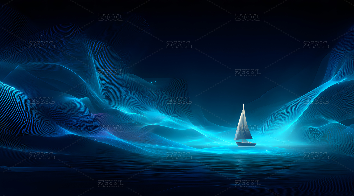 蓝色光效背景上一艘帆船