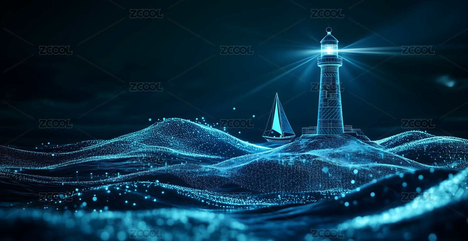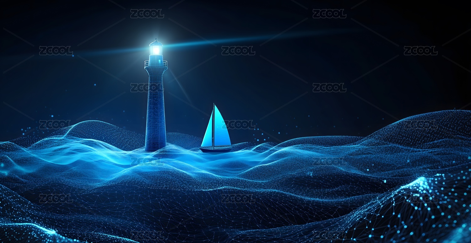 蓝色科技灯塔下的帆船概念背景