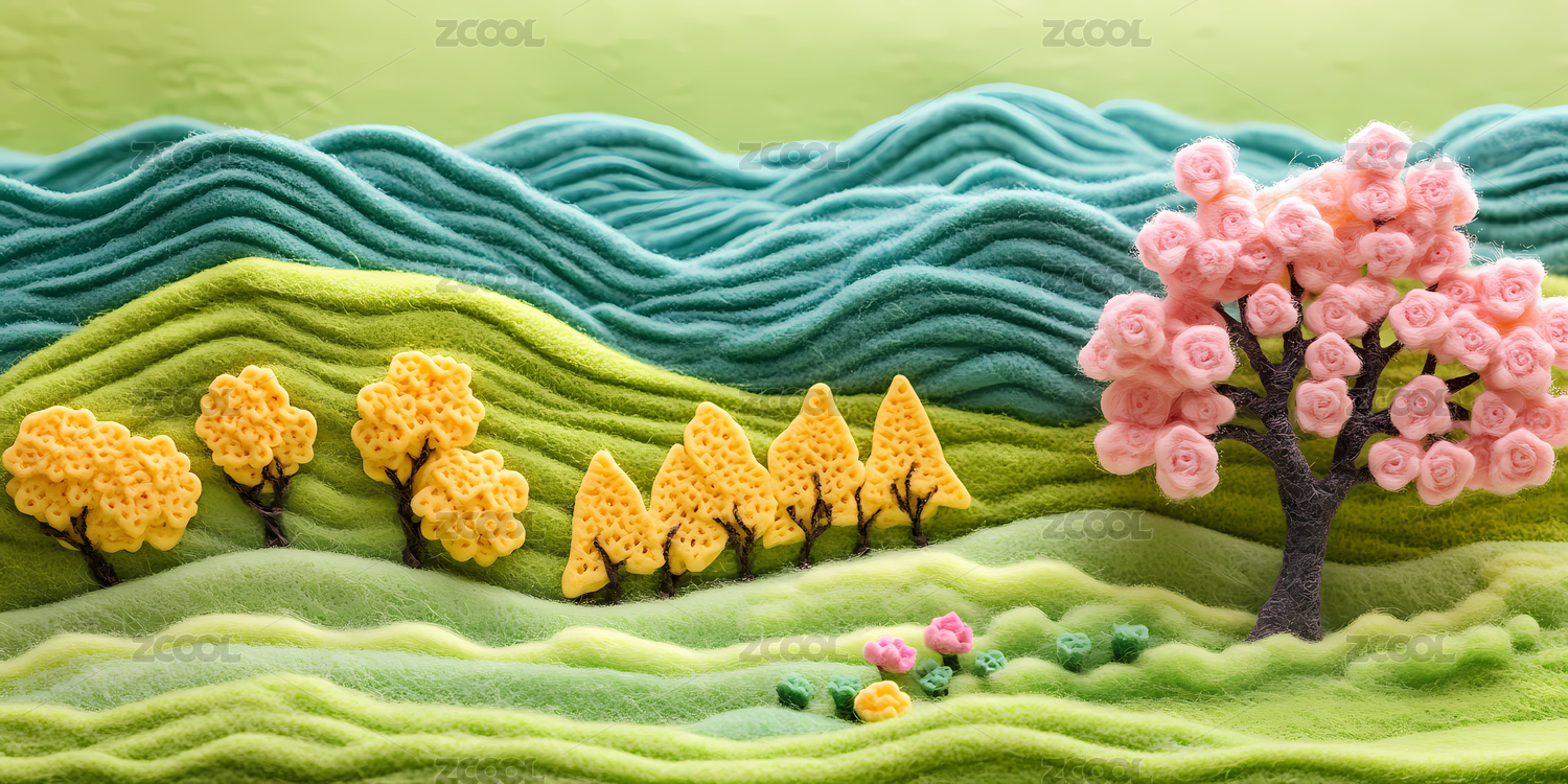 羊毛,毛毡,树,丘陵,山,春天,绿色,蓝色,色彩,手工