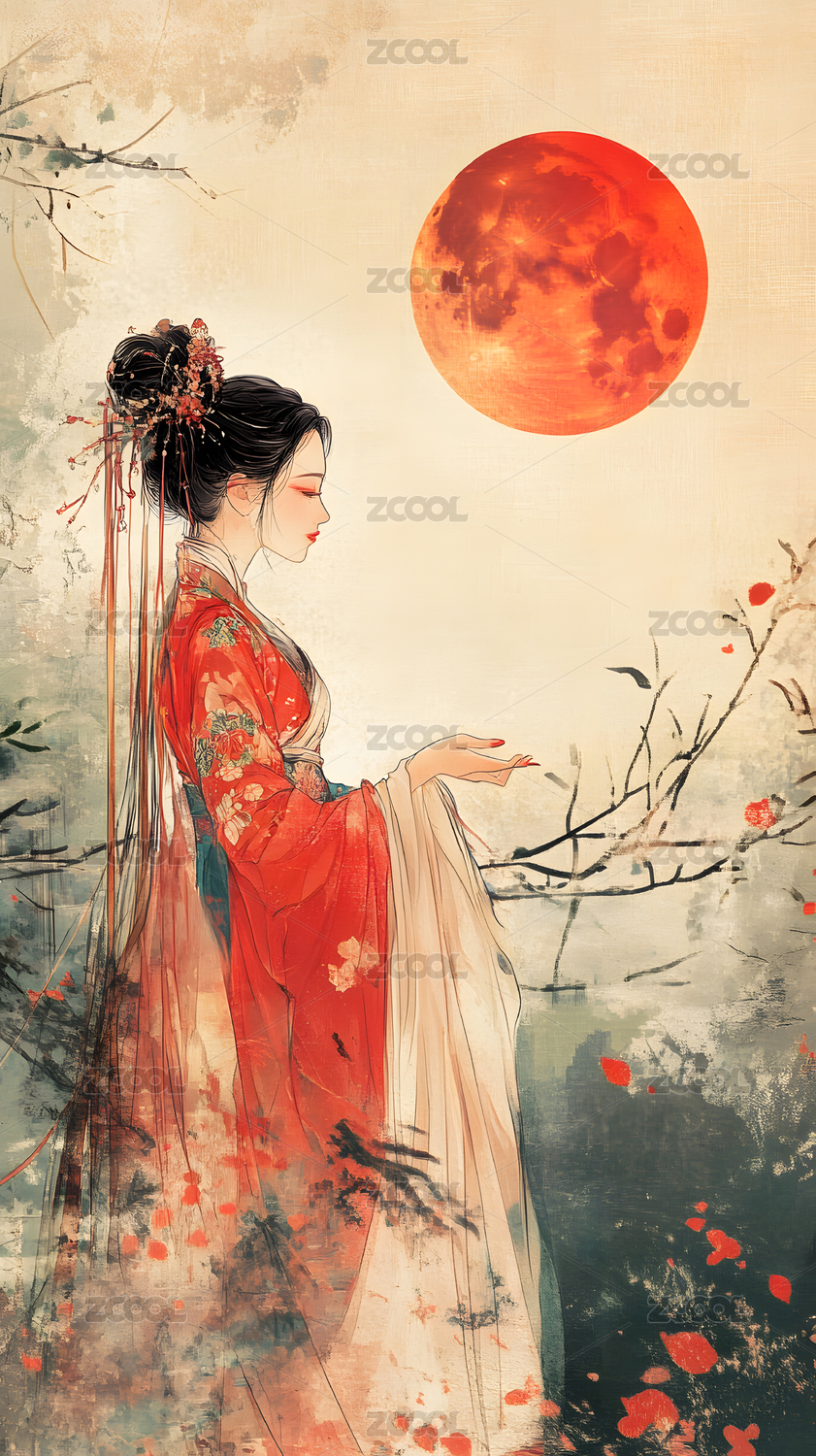 红衣女子古风插画高清壁纸