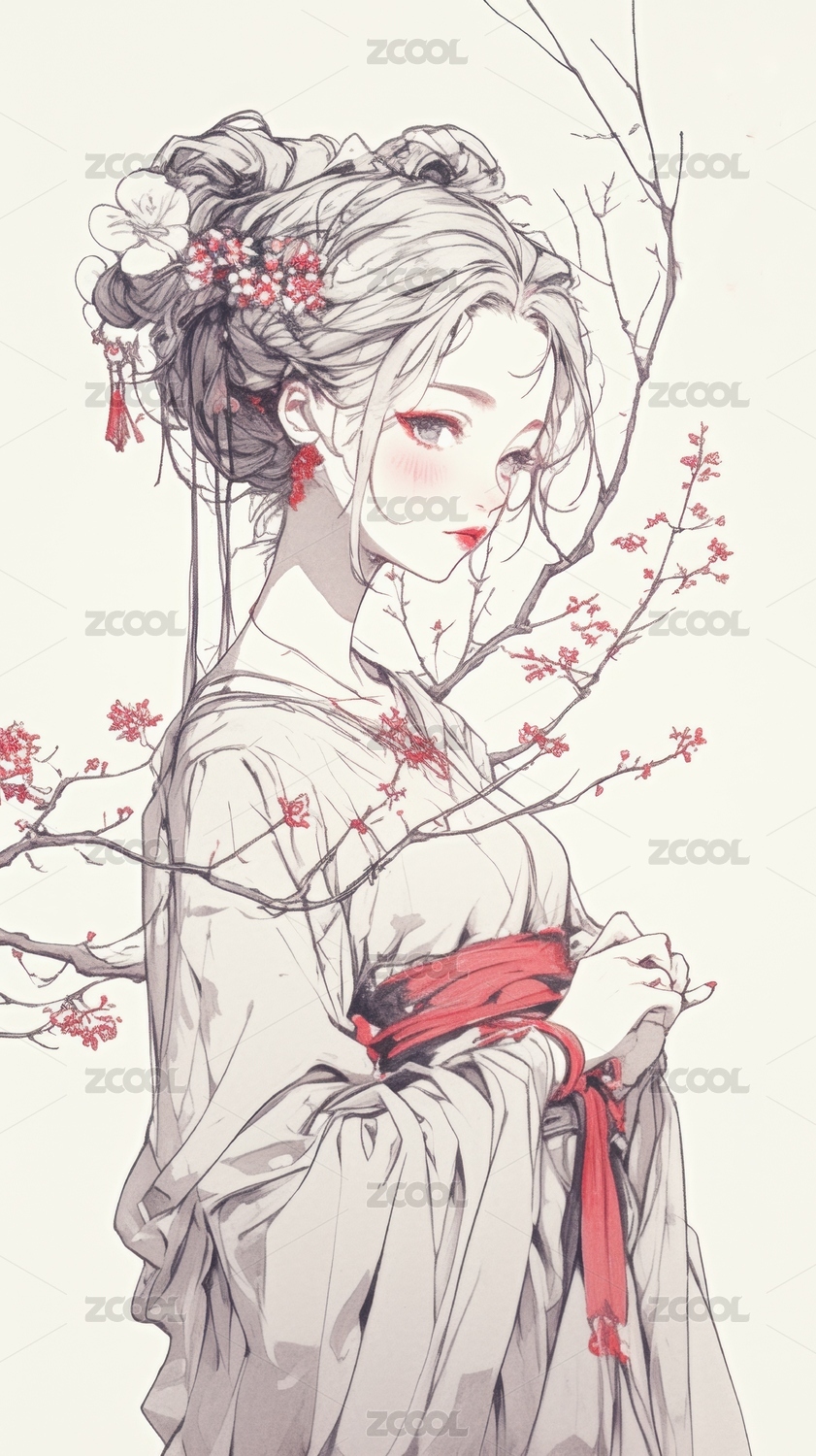红衣女子与花枝的写意画