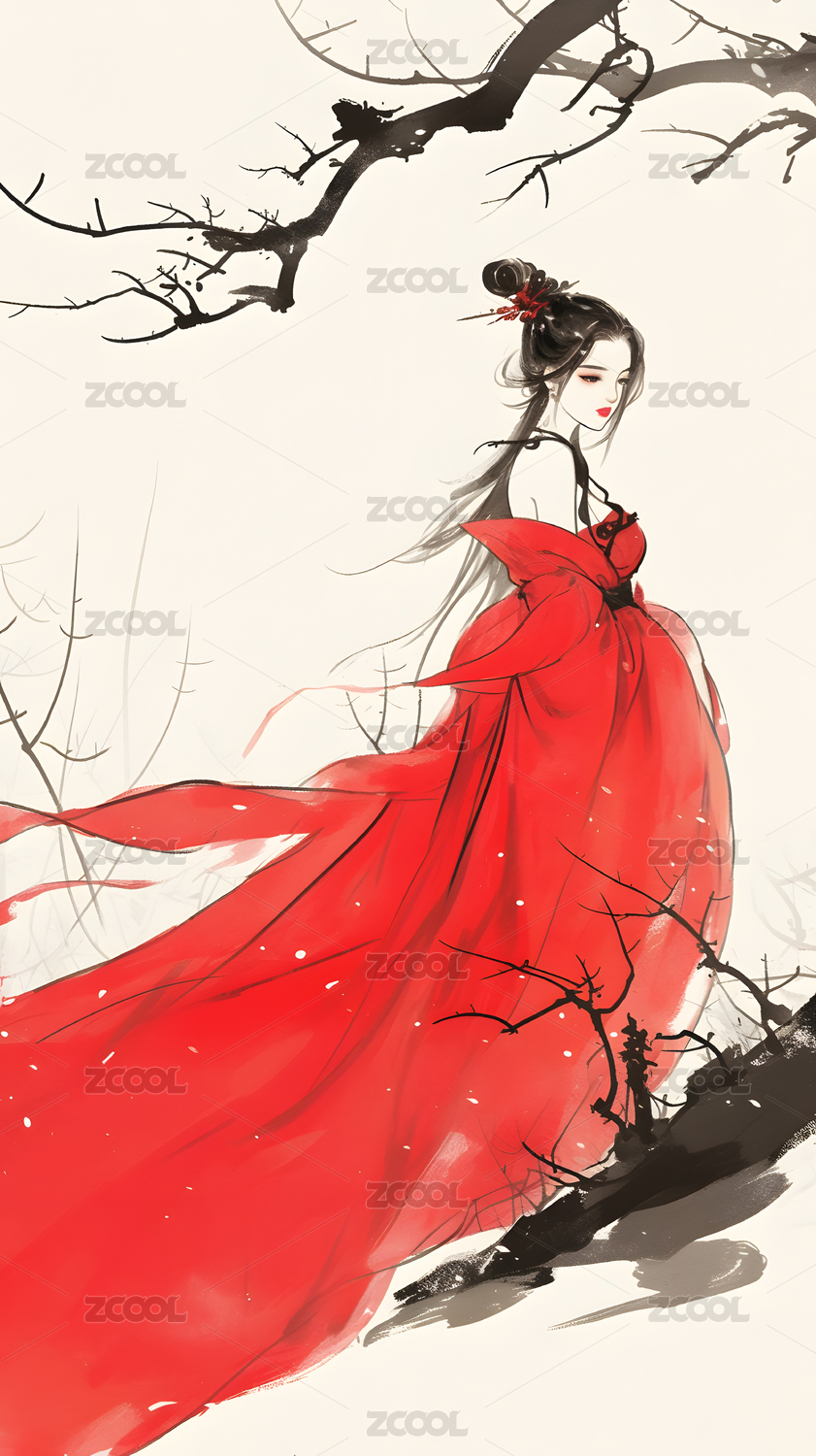 水墨红梅美人图