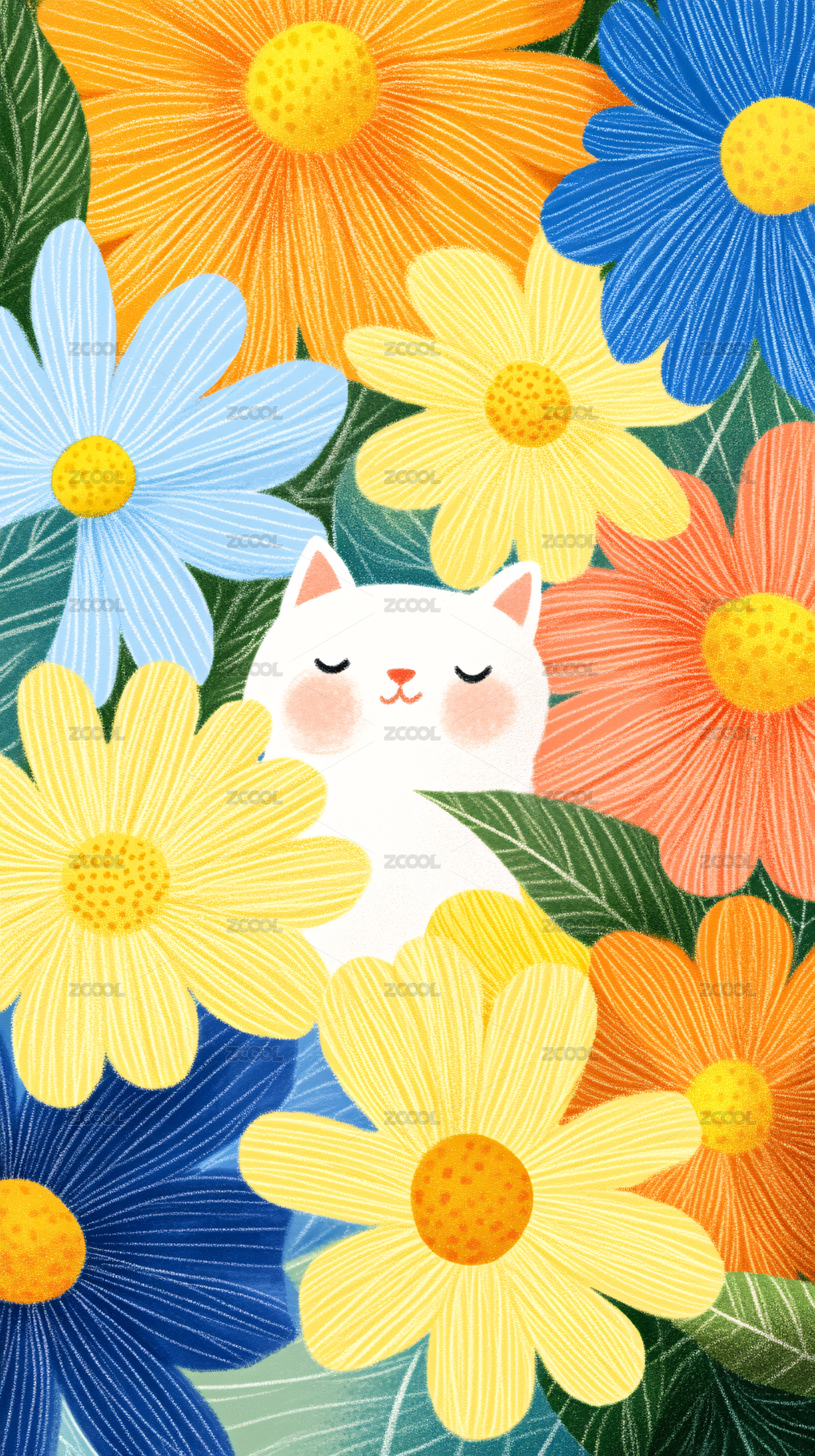 儿童插画一只小猫在五颜六色的花丛中