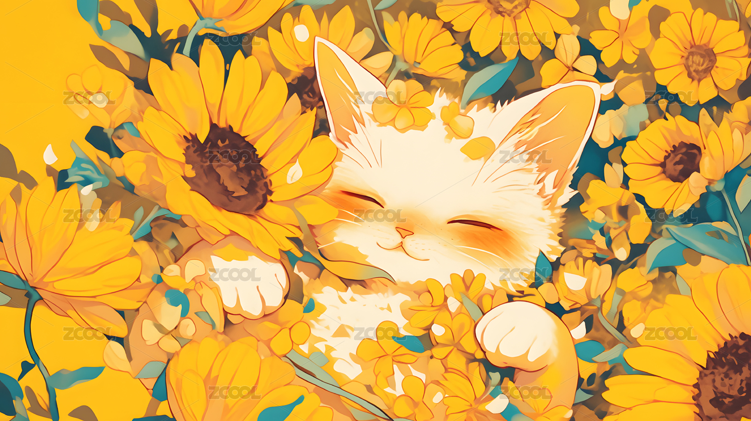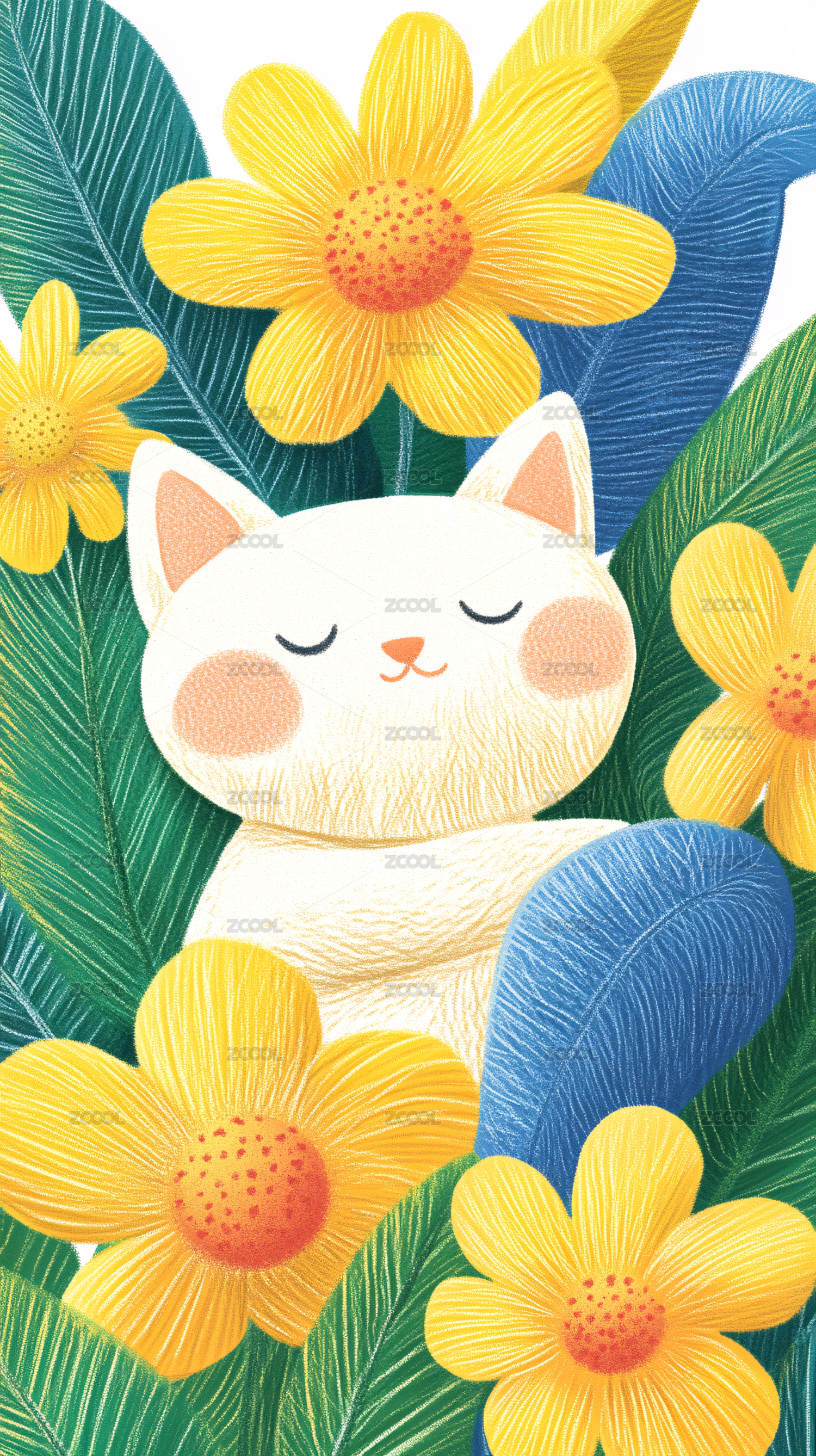 白猫黄色绿叶花朵