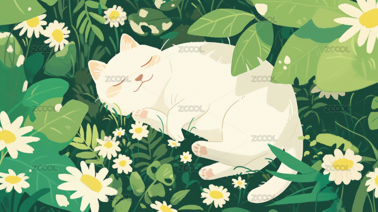 小清新猫草地花朵插画