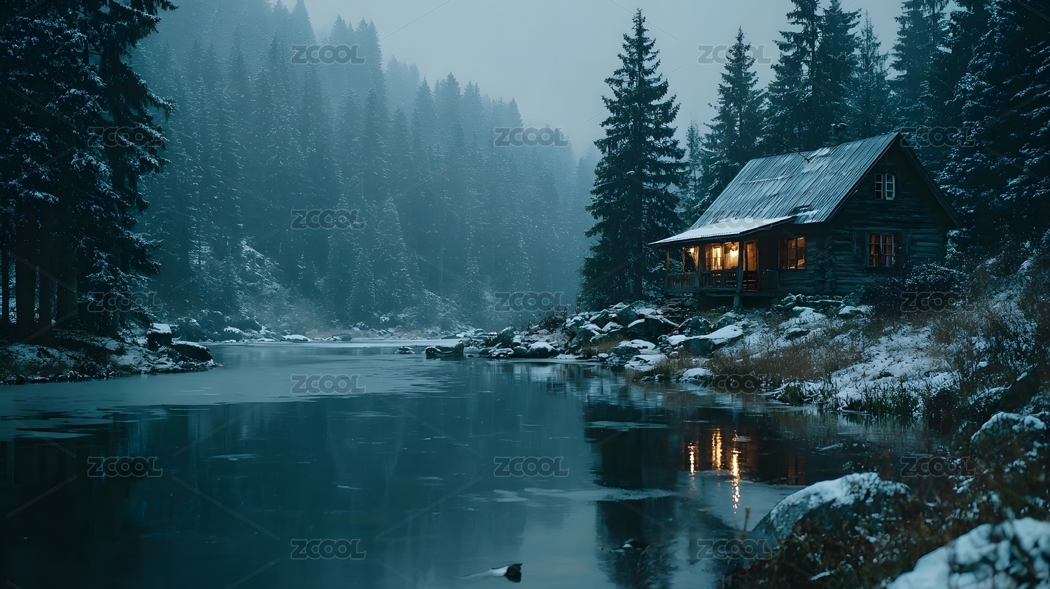 冬日湖畔小屋静谧雪景