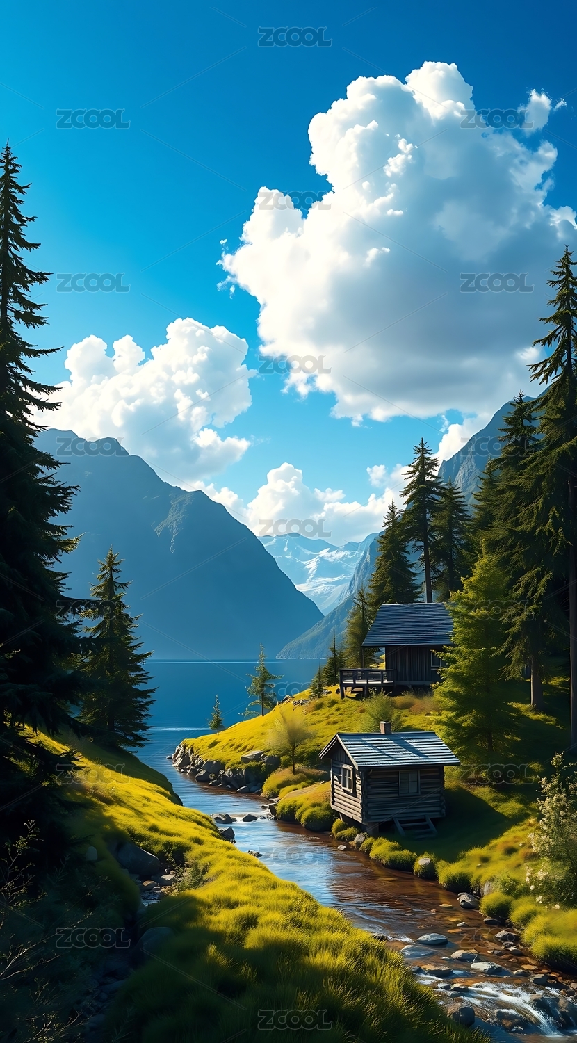 湖畔小木屋与自然风光