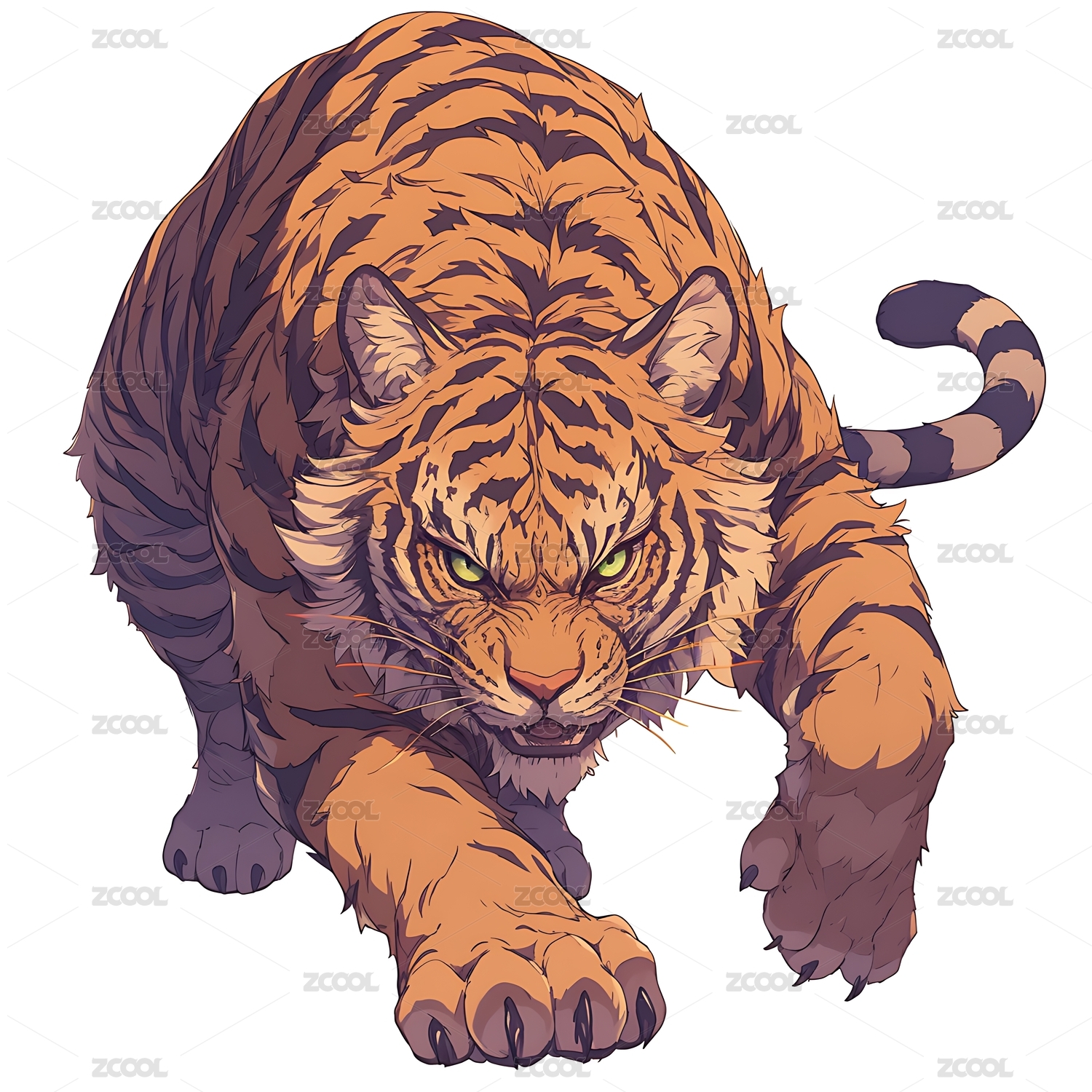 一幅动漫风格的插图描绘了一只老虎,从远处