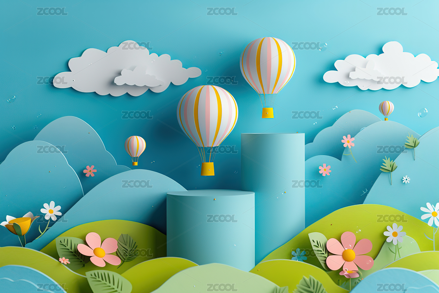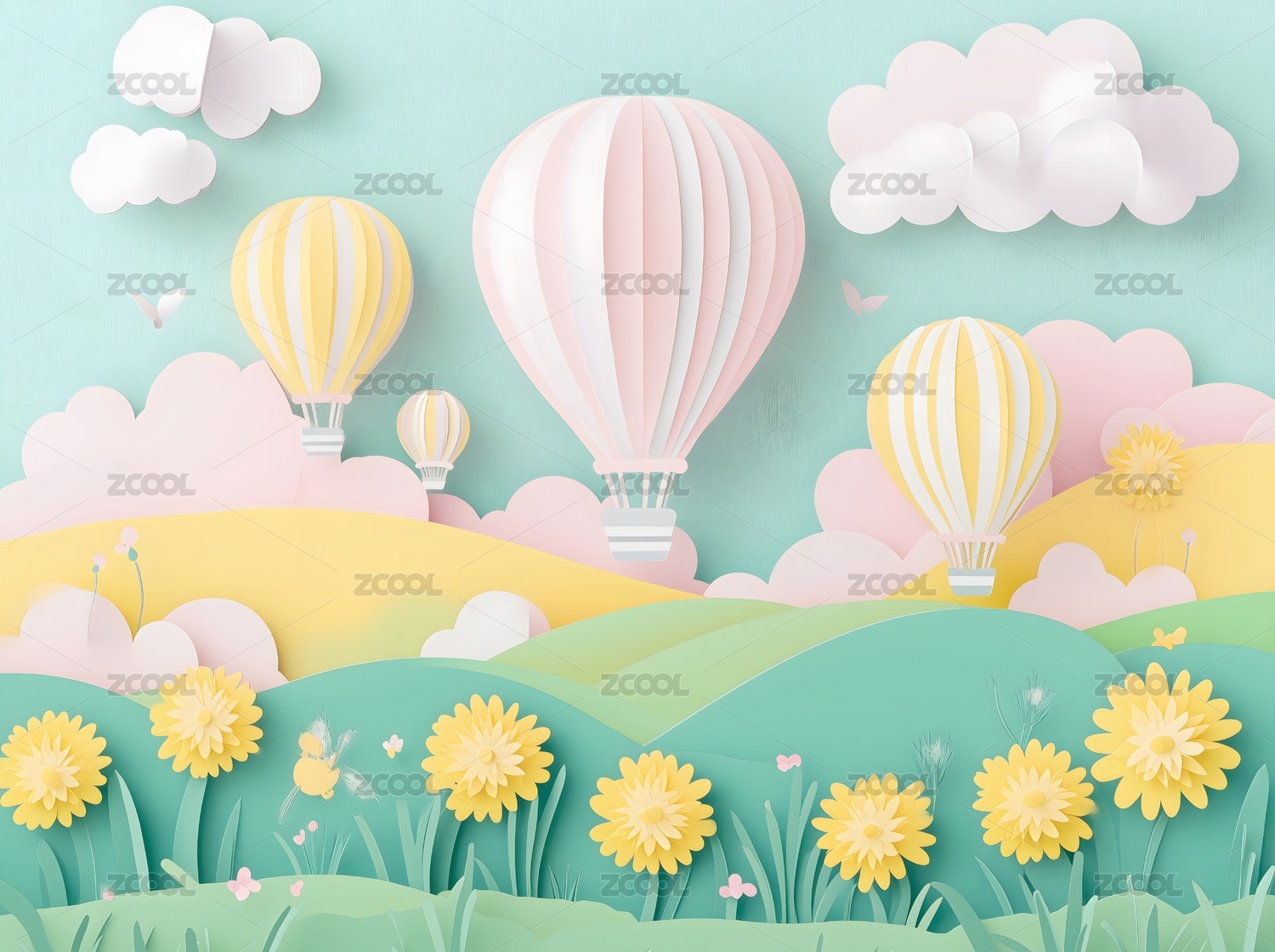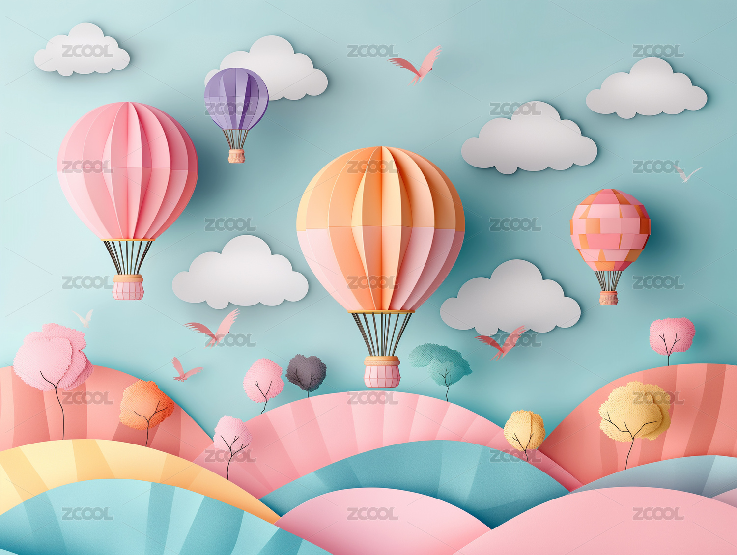 粉红色的热气球与白云和蓝天剪纸艺术