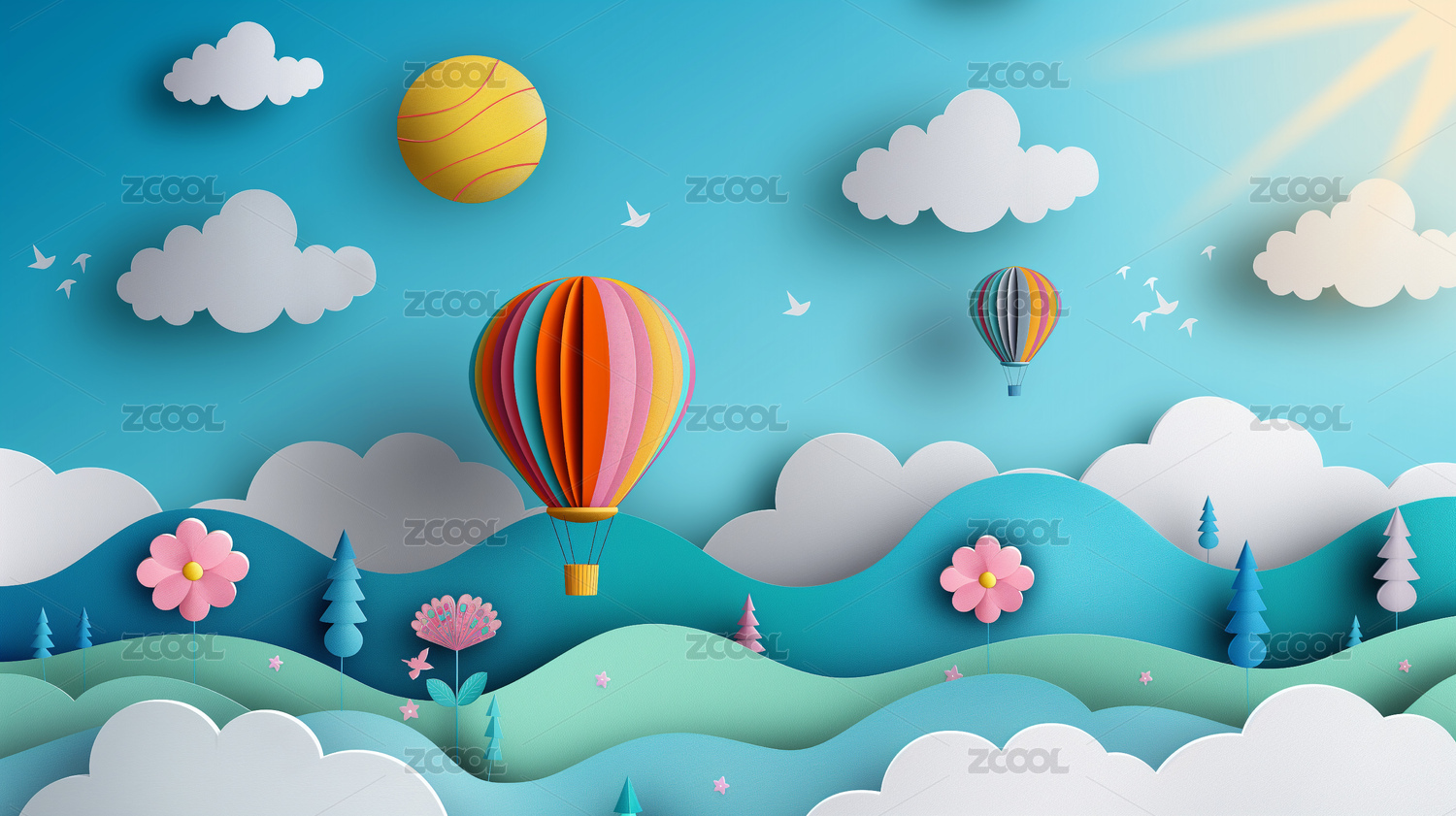 飞在空中的剪纸热气球