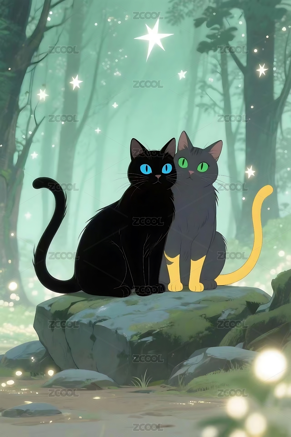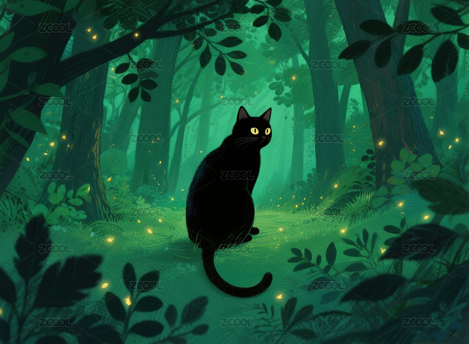 黑猫,梦幻,柔和,光影,童话,萤火虫,夜晚,可爱,氛围,意境