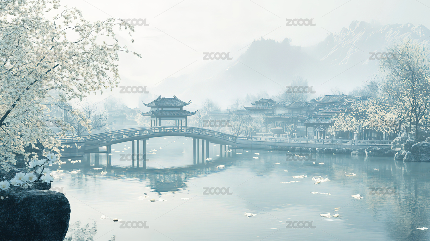 中国风山水画江南古桥拱桥凉亭