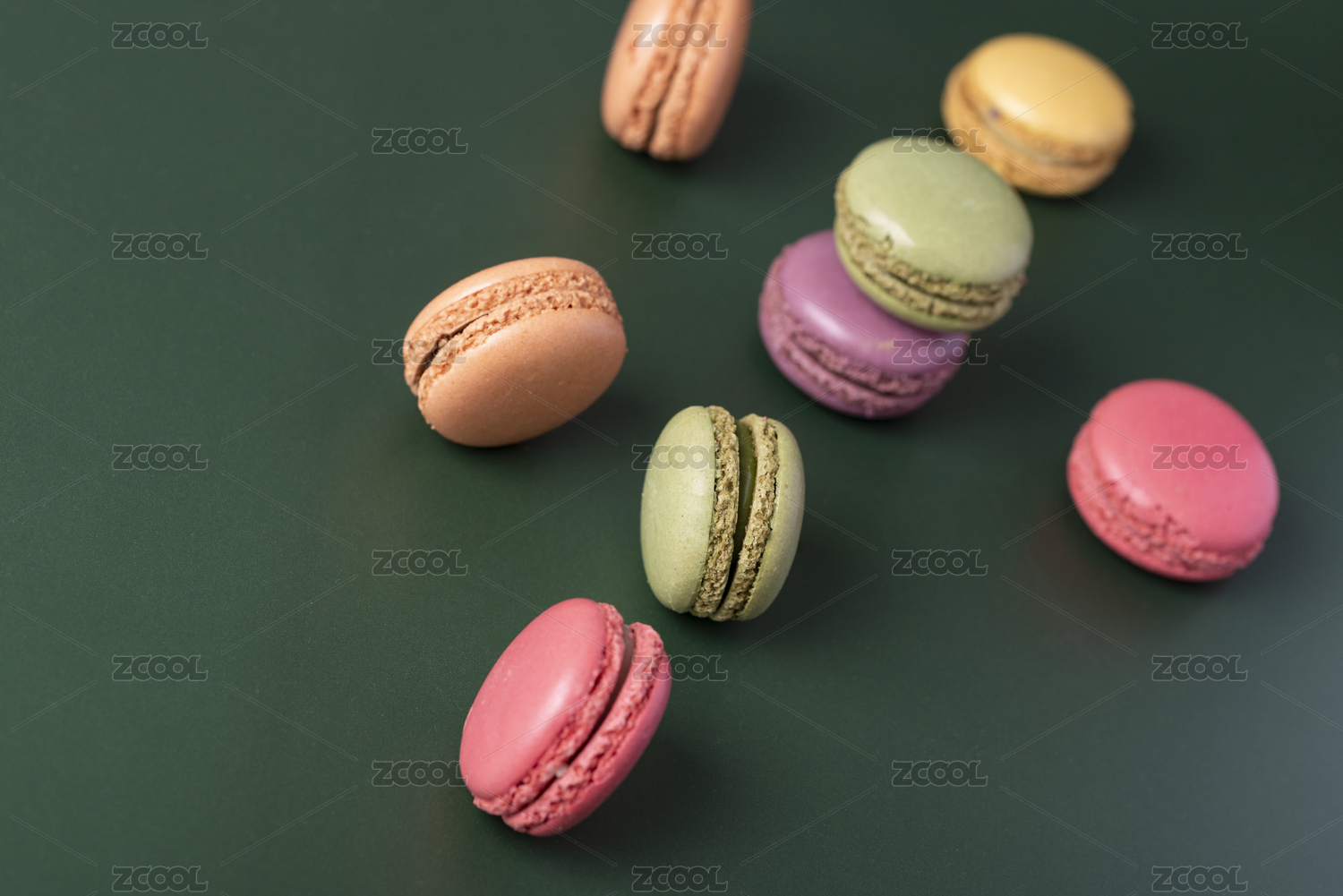 墨绿色桌面上摆放的五颜六色甜点马卡龙