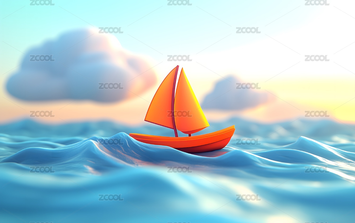 一艘卡通小帆船行驶在海面上