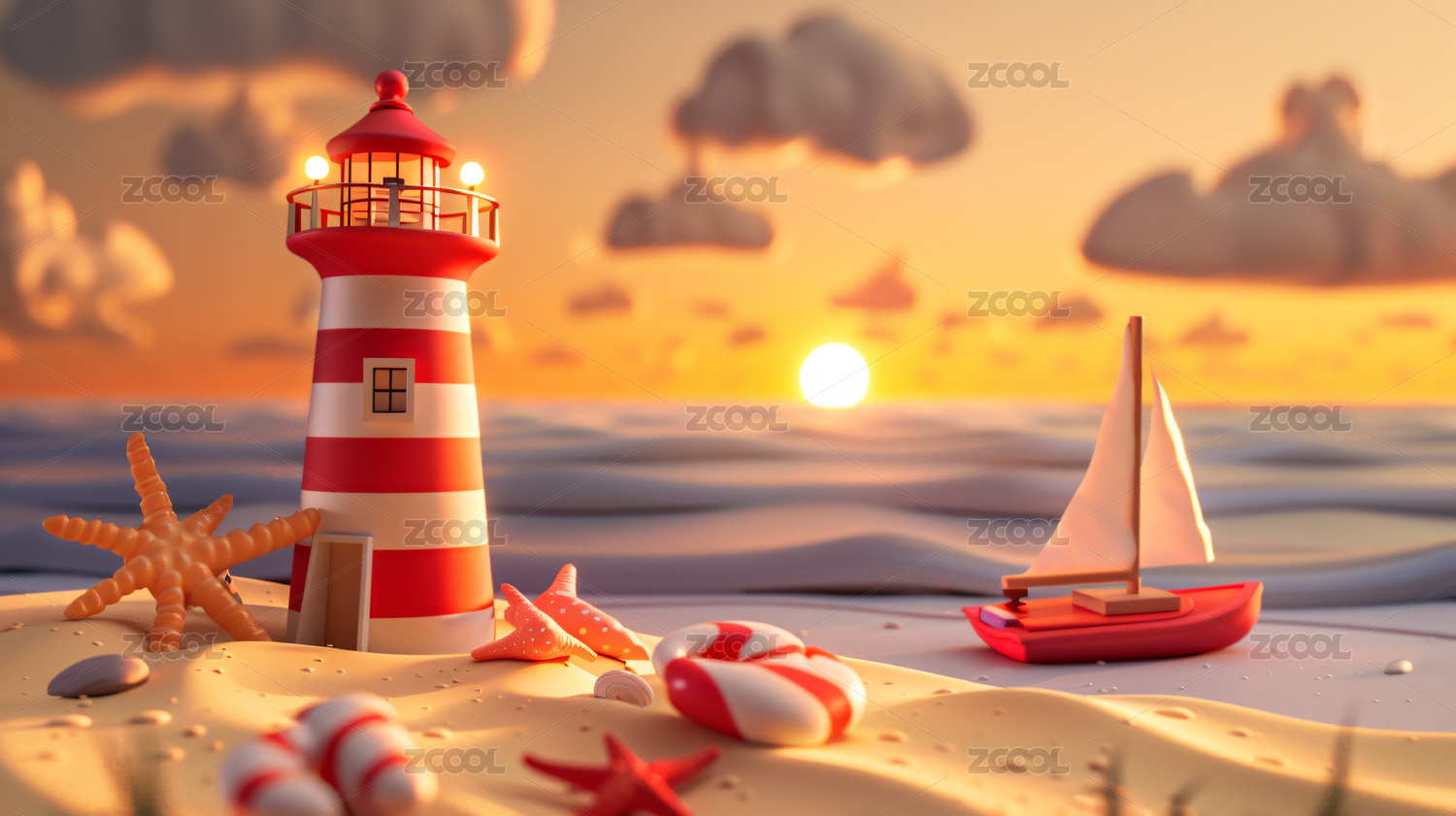 日出时的海滩对天景色3D场景插画