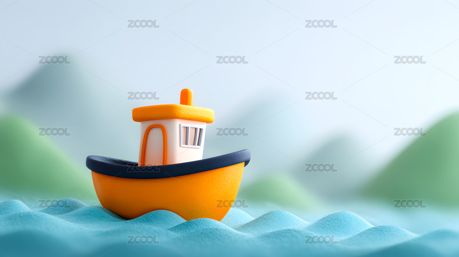水面上一艘可爱的卡通小船