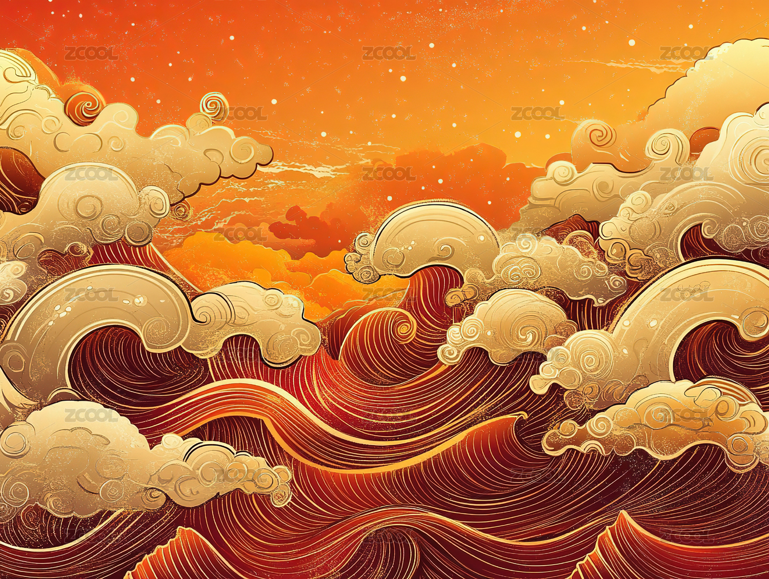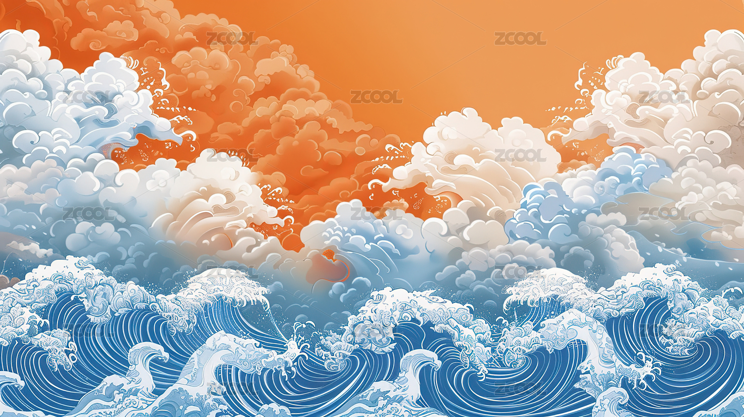 海浪,云朵,水墨风,国风,祥云,波涛,翻涌,蓝色,白色,红色