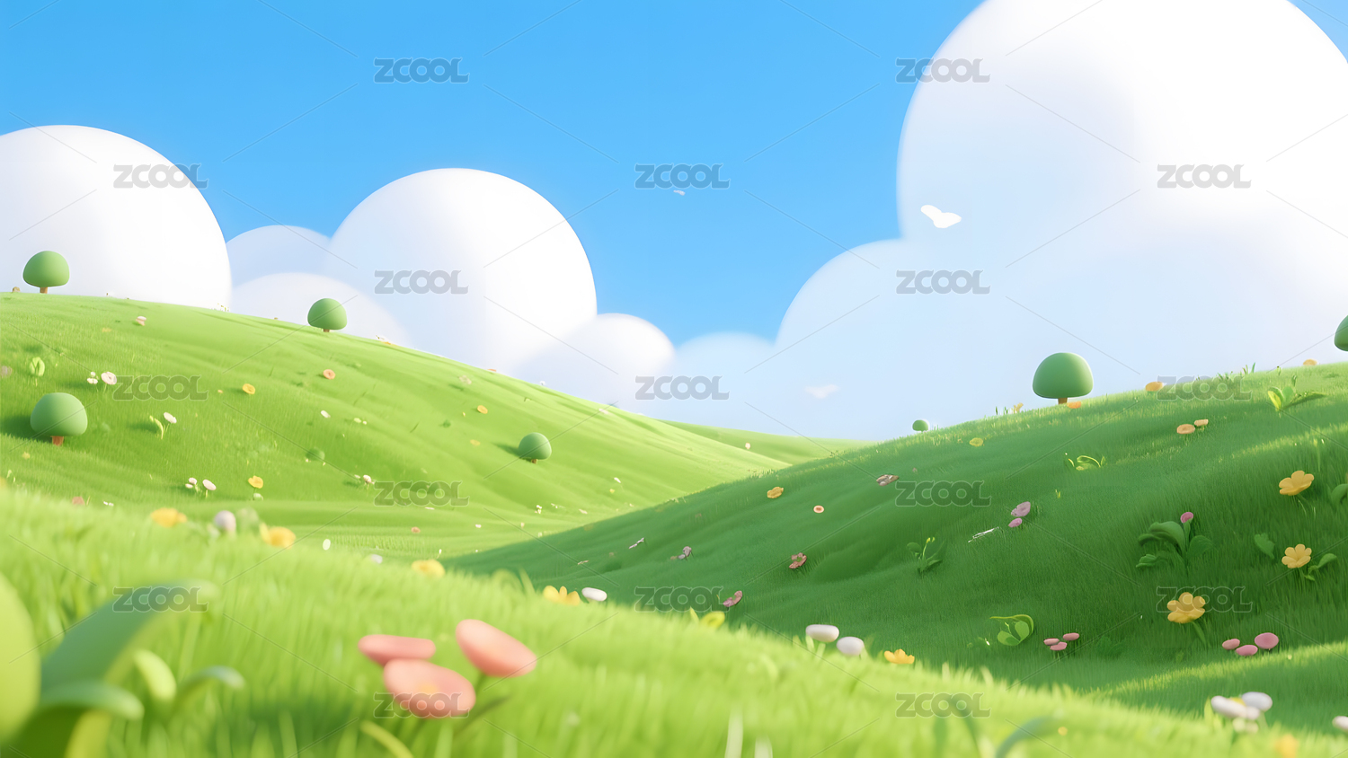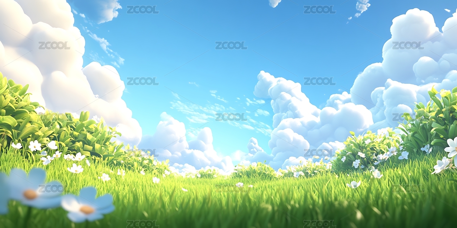 3d渲染卡通蓝天白云绿草地