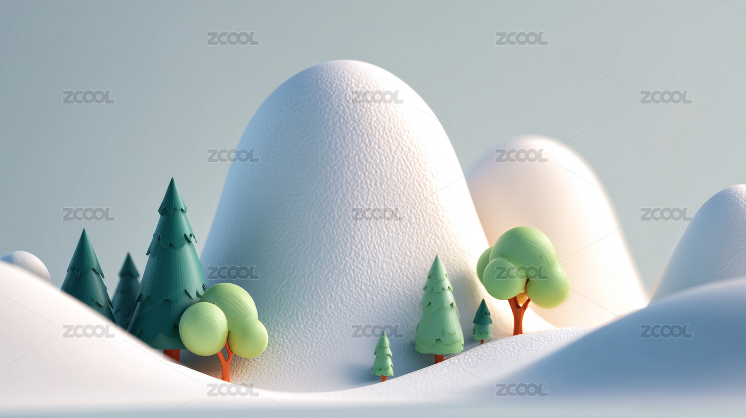 冬天晴天有树白雪的起伏山3D立体卡通插画