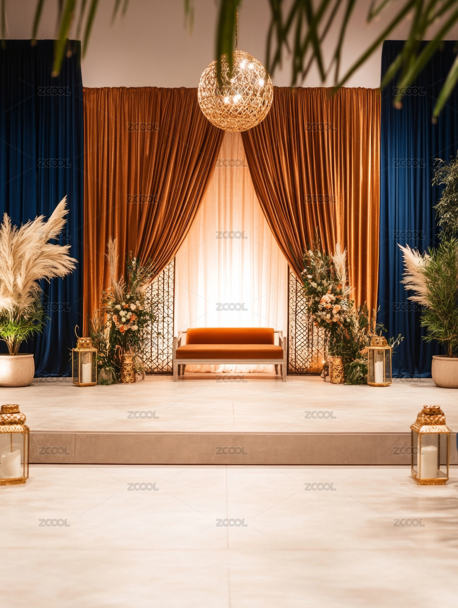 婚礼,舞台,装饰,窗帘,吊灯,鲜花,蓝色,金色,优雅,现代