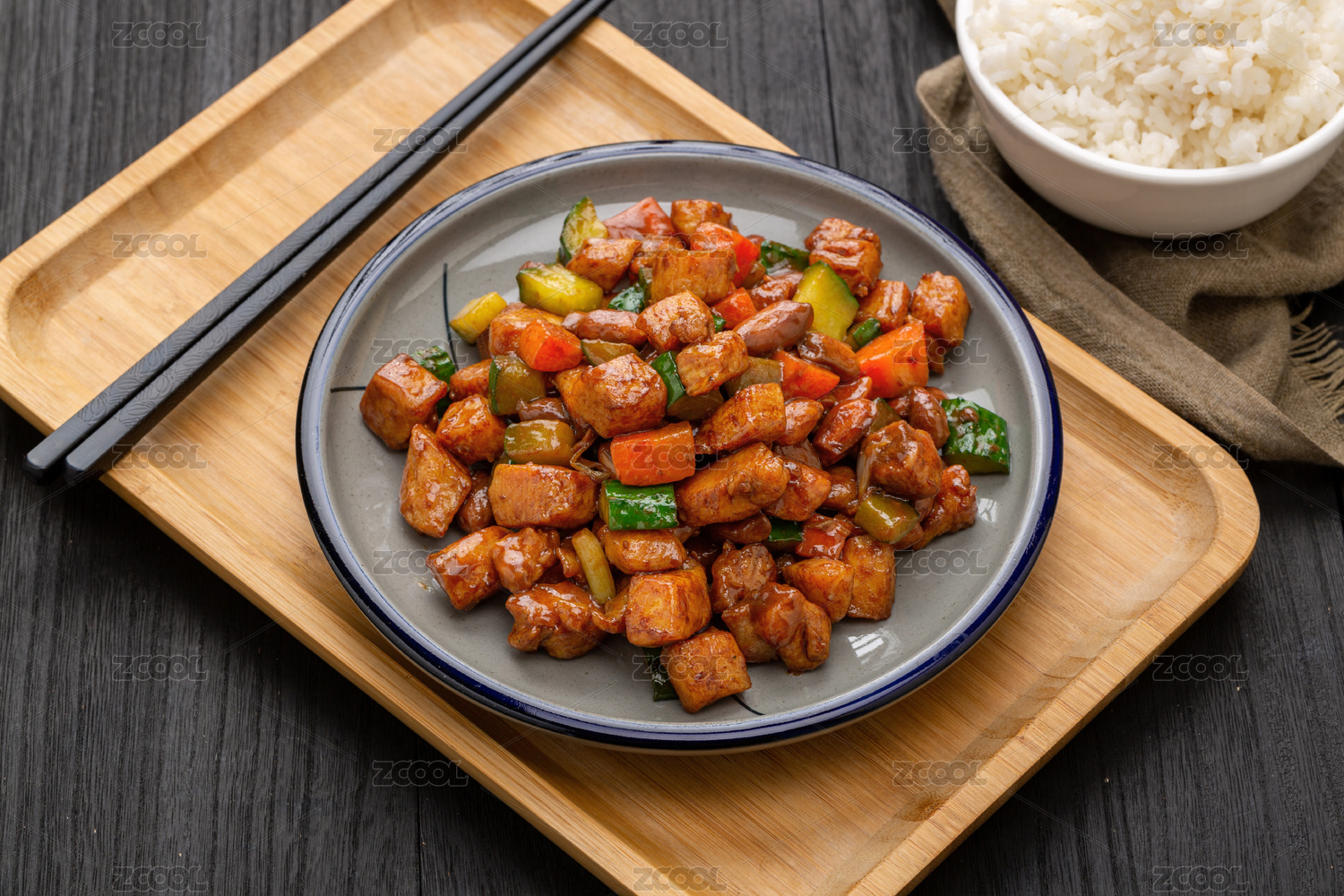 木纹桌上放着一碗鱼杂豆腐盖饭