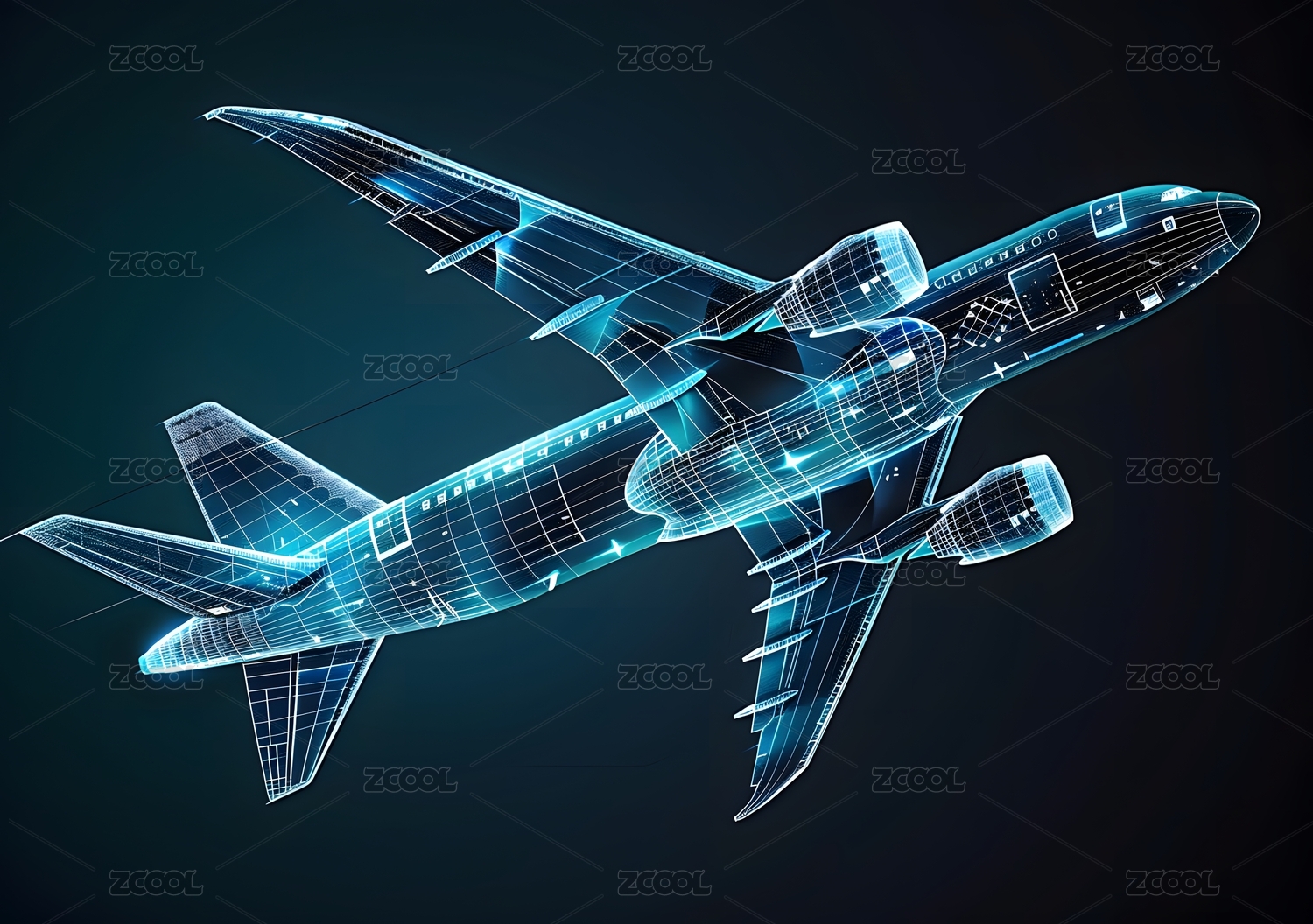 飞机,蓝色光效,科技线条,科幻风格,插画