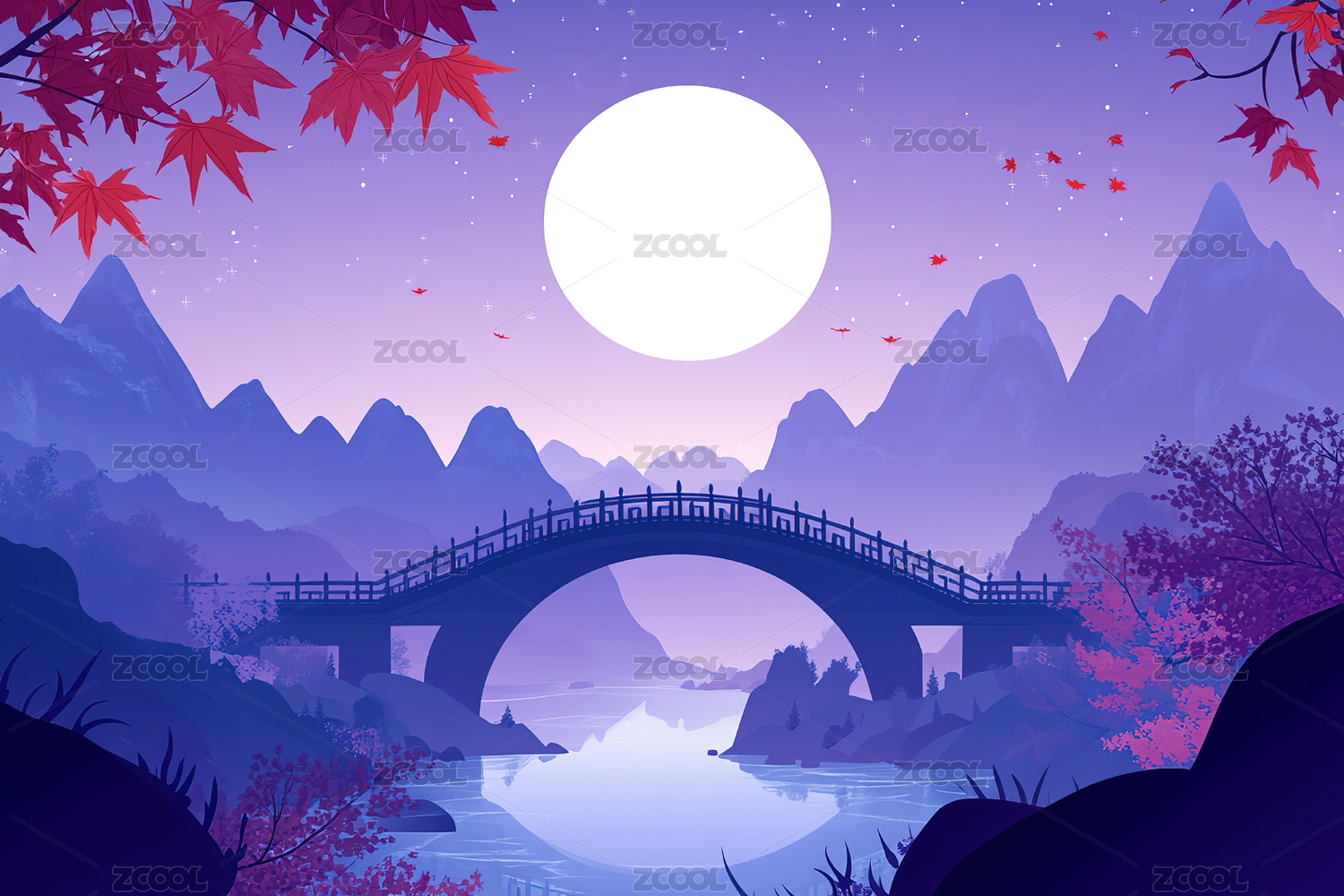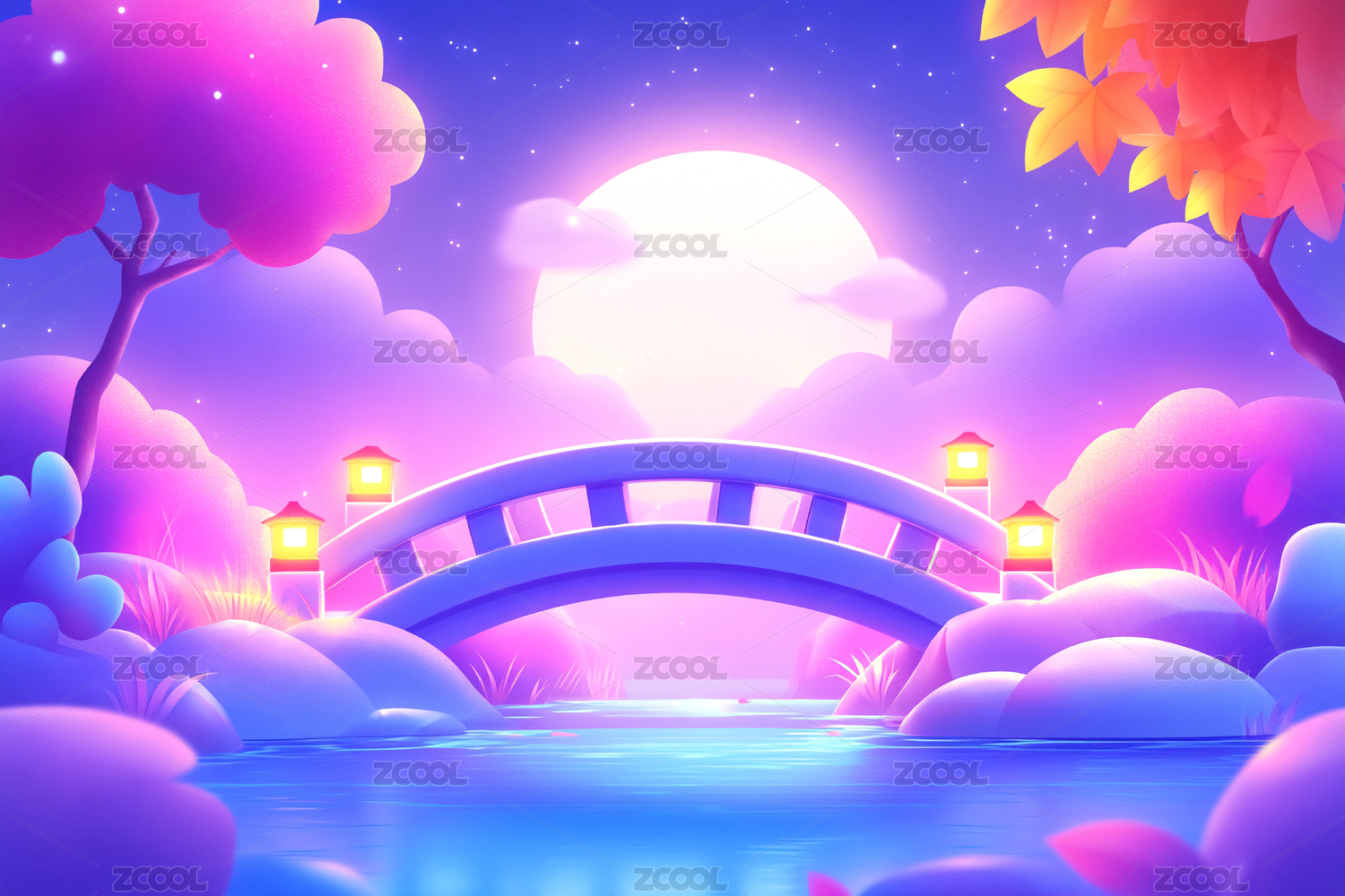 桥, 秋天, 落叶, 月亮, 湖泊, 树木, 紫色, 粉色, 橙色, 水彩