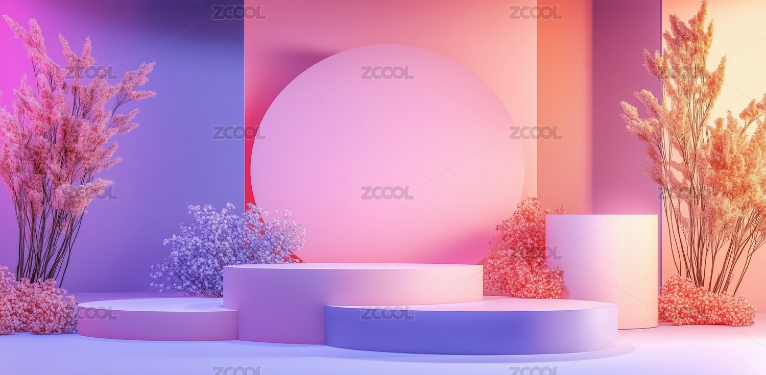渐变色背景下的圆形讲台与植物装饰