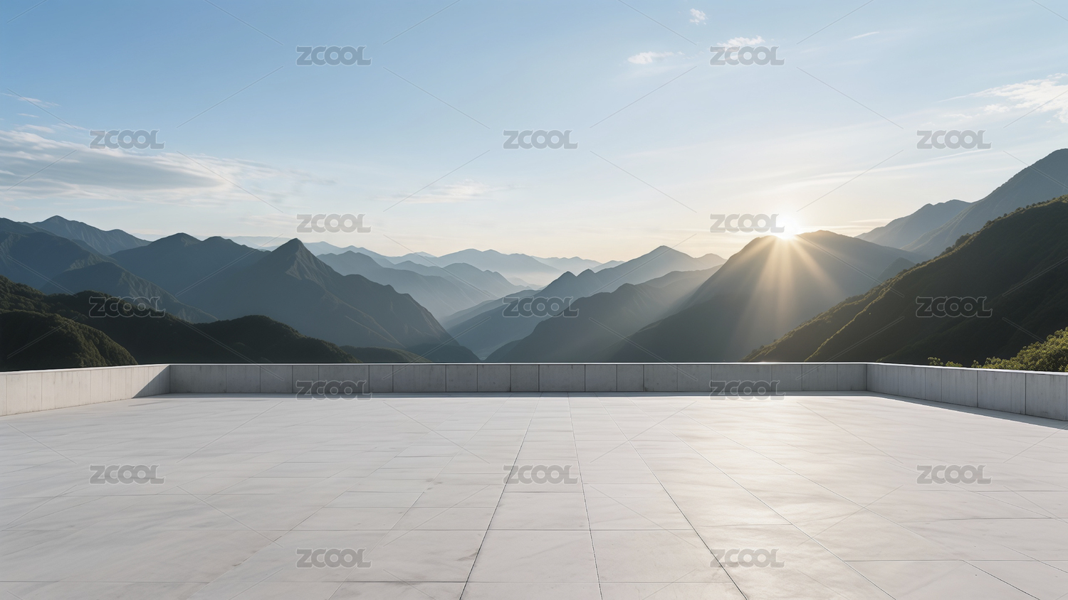 从砖地高架广场平台观看山脉上的日出