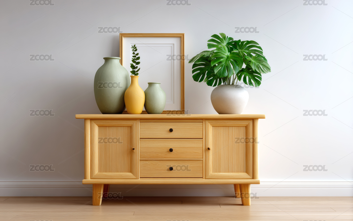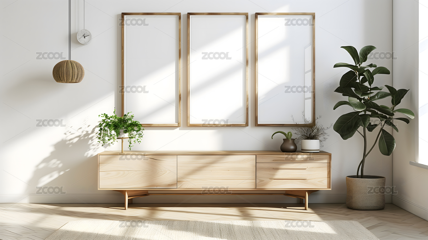 带有空框架和室内植物的极简室内设计