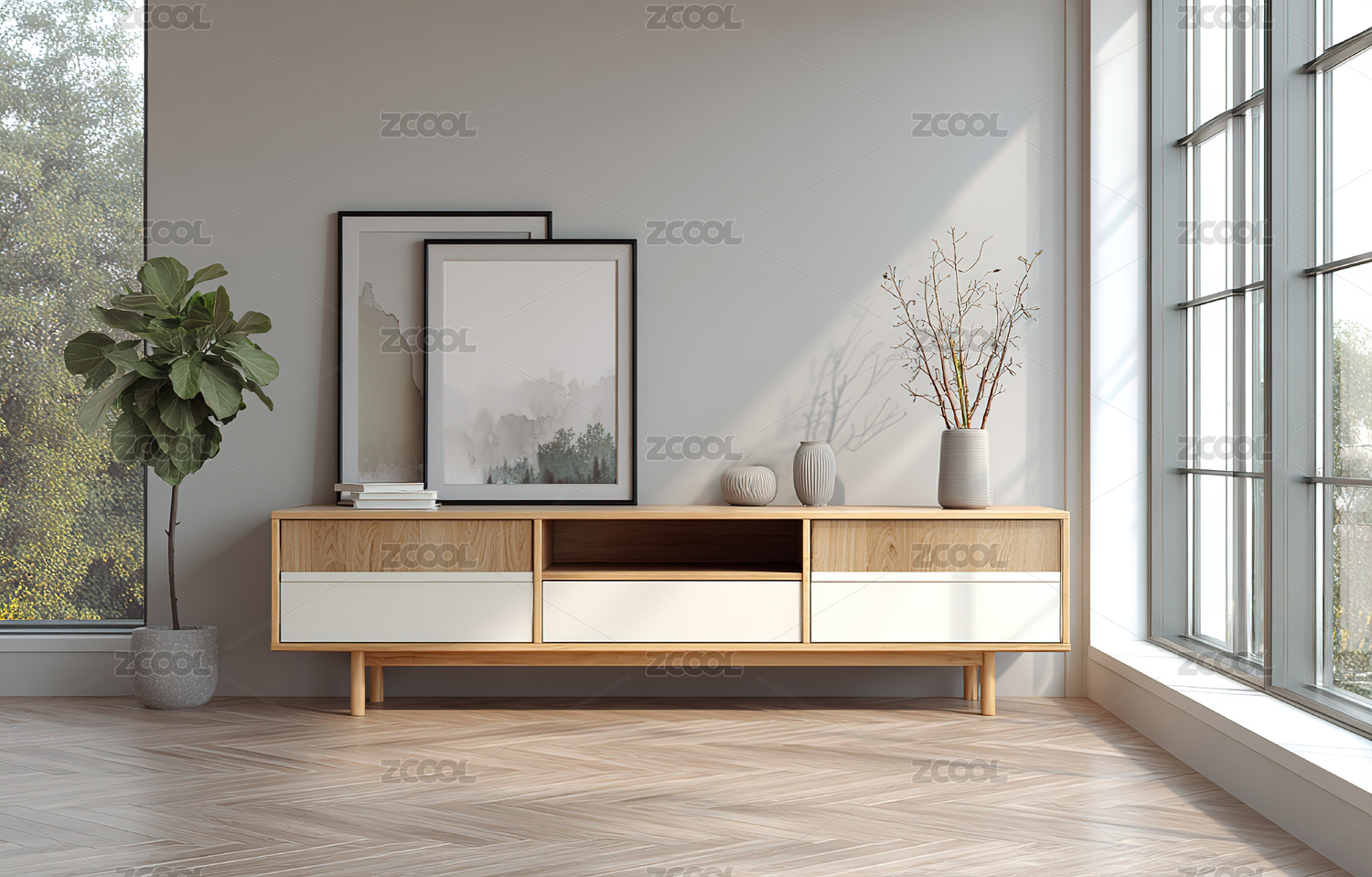 简约木柜摆饰自然光影图