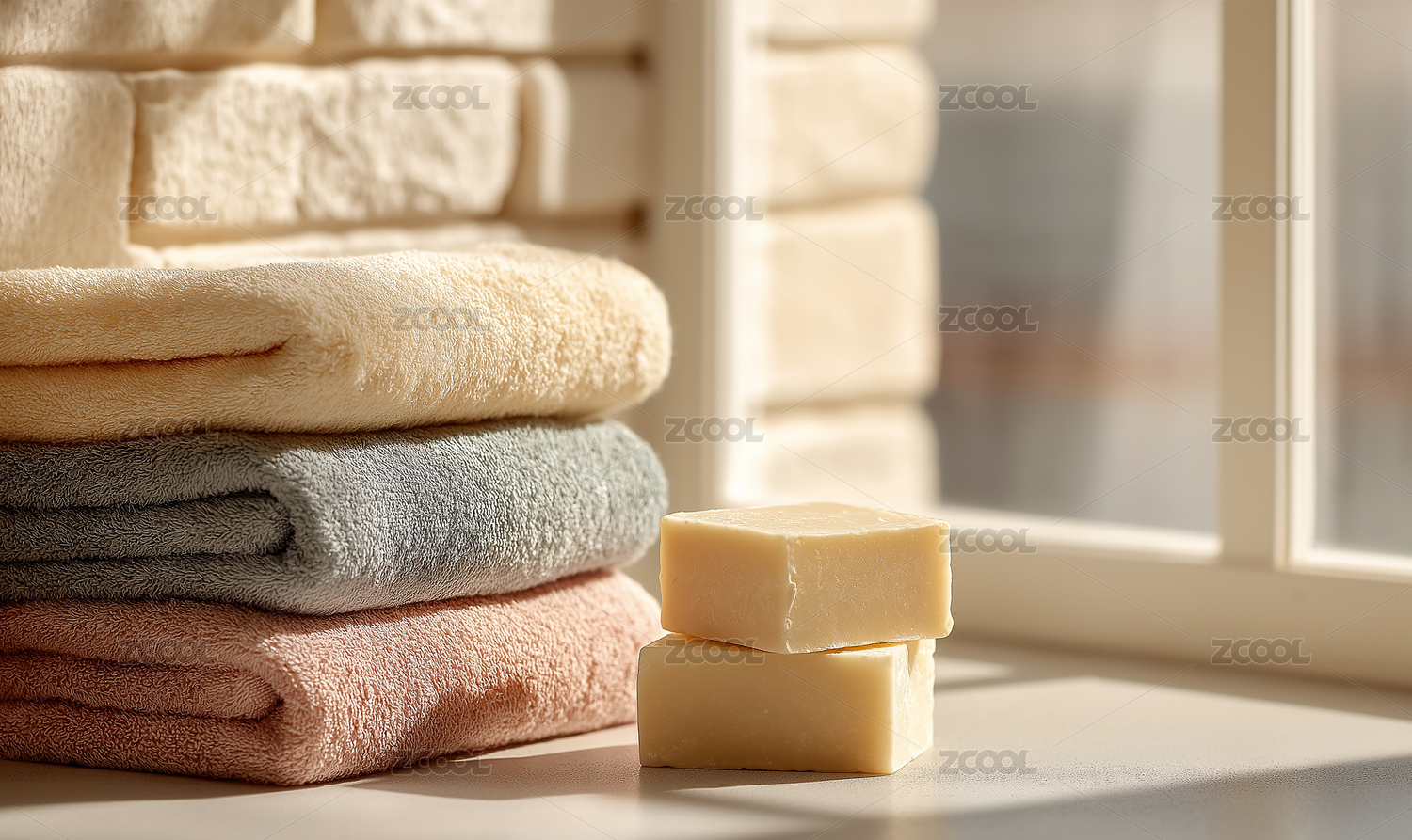 窗边堆叠毛巾上放香皂的温馨静物素材