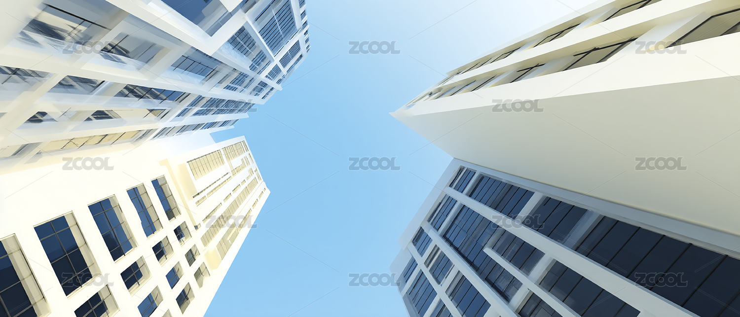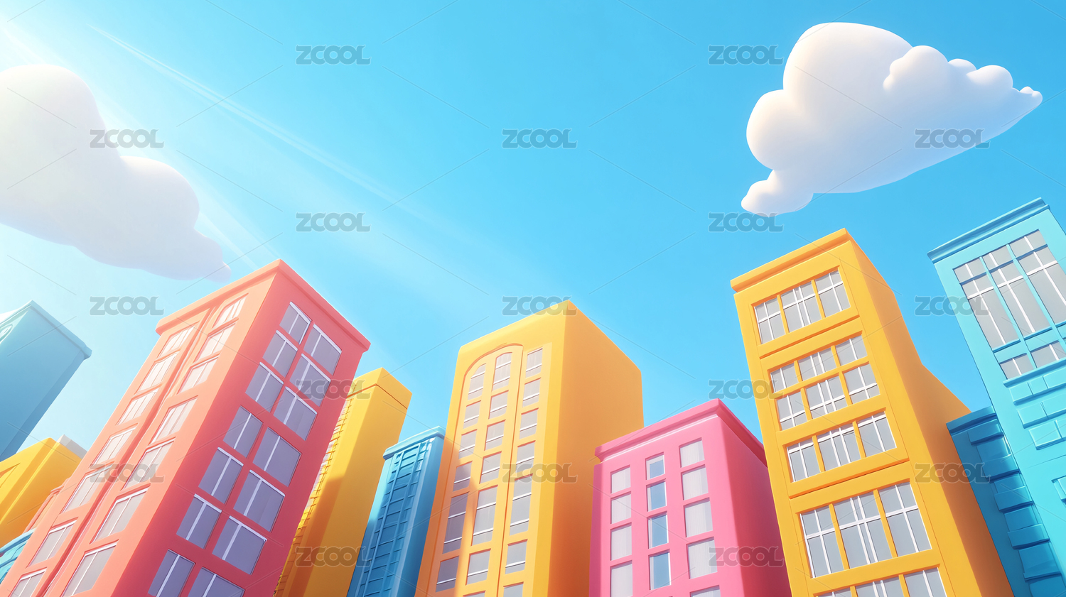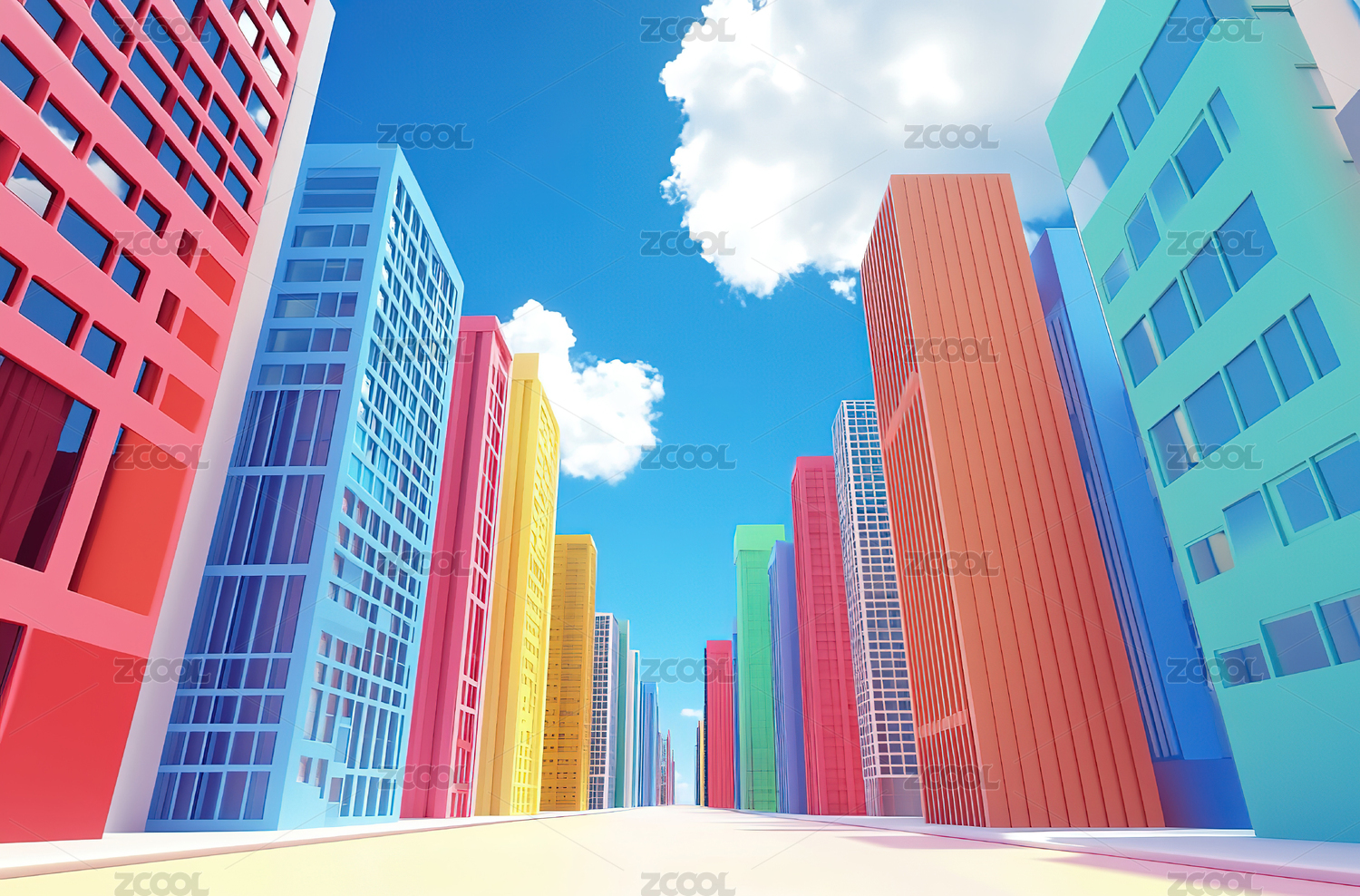 白天仰视彩色城市建筑摩天大楼3D立体插画