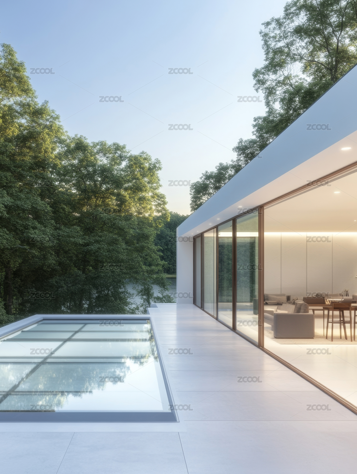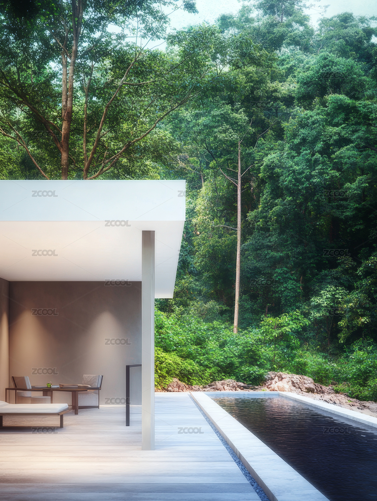 现代,建筑,别墅,游泳池,绿树,室外,躺椅,大玻,璃窗,自然