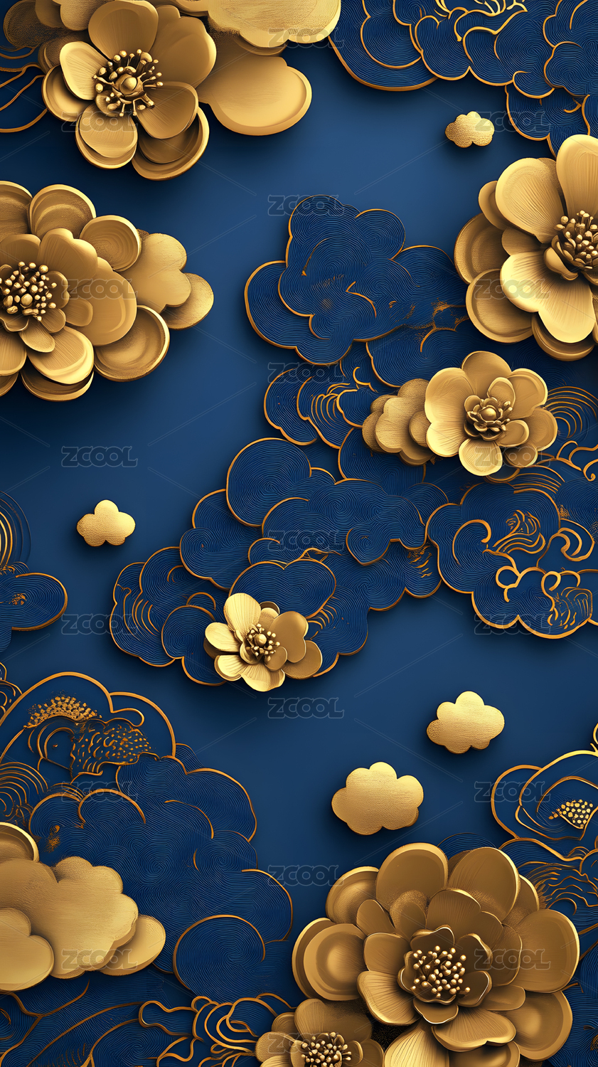 祥云,金色,花朵,纹理,蓝色,背景,壁纸,艺术,设计,图案