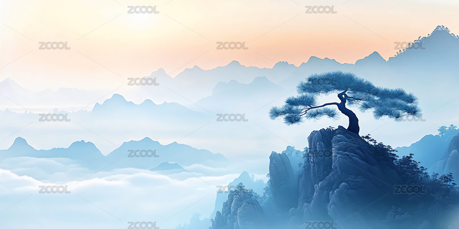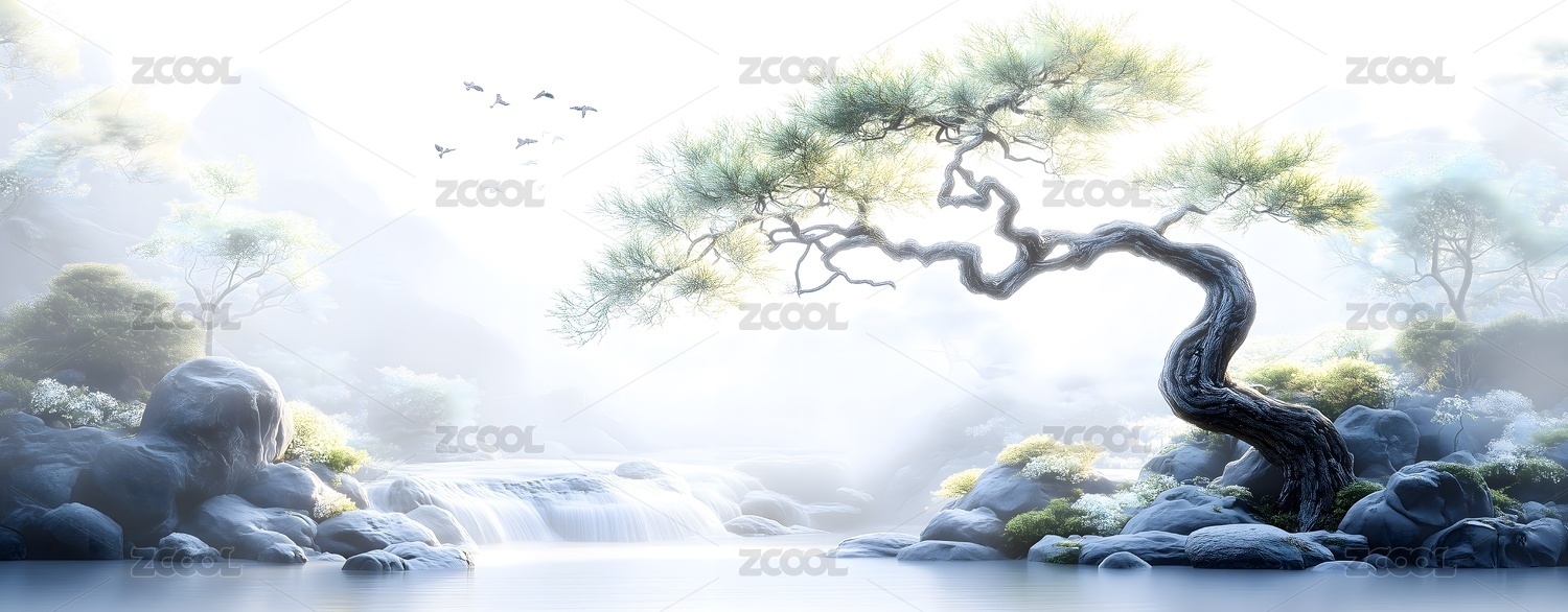 自然,山峦,树木,景色,飞鸟,意境,宁静,松树,湖泊,岩石