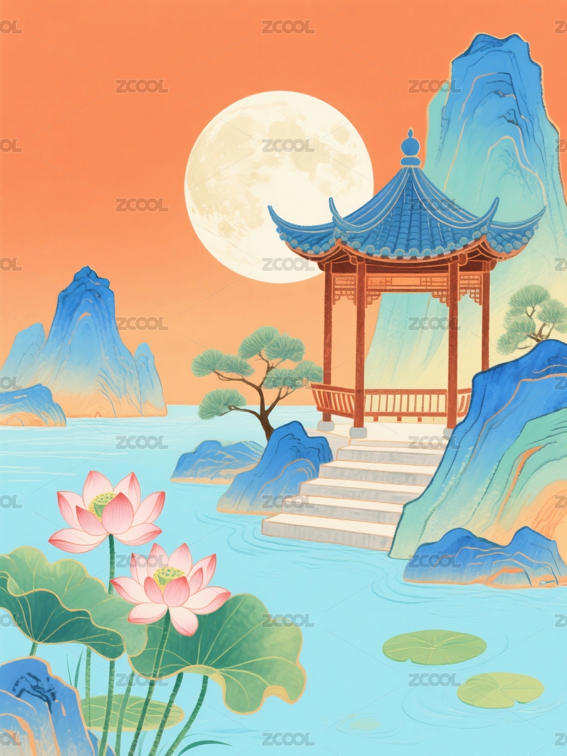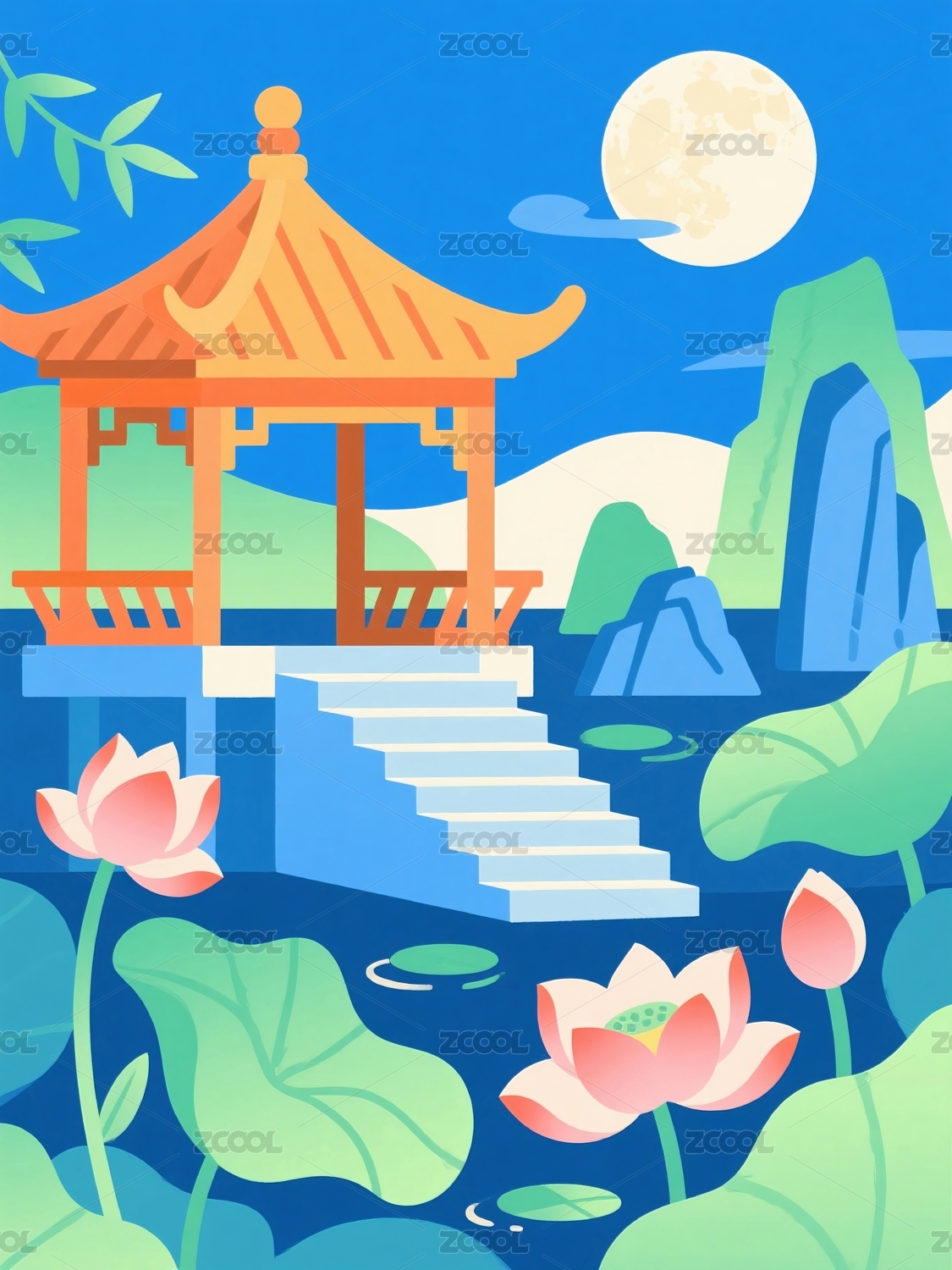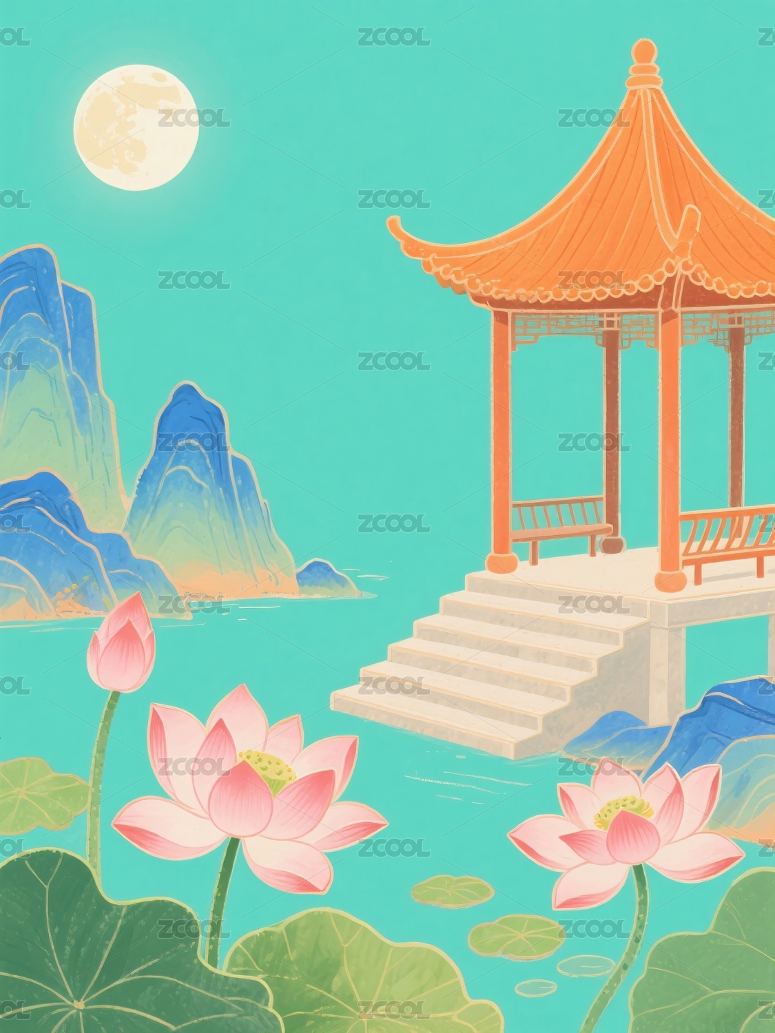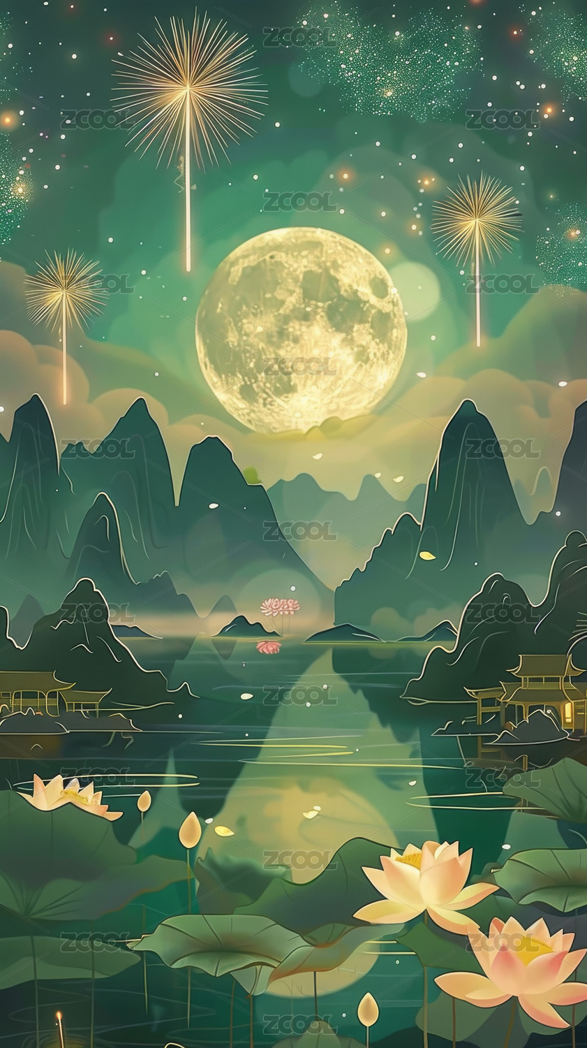 中秋节, 月亮, 烟花, 中国风, 荷花, 莲花, 粉色, 花瓣, 建筑, 亭子