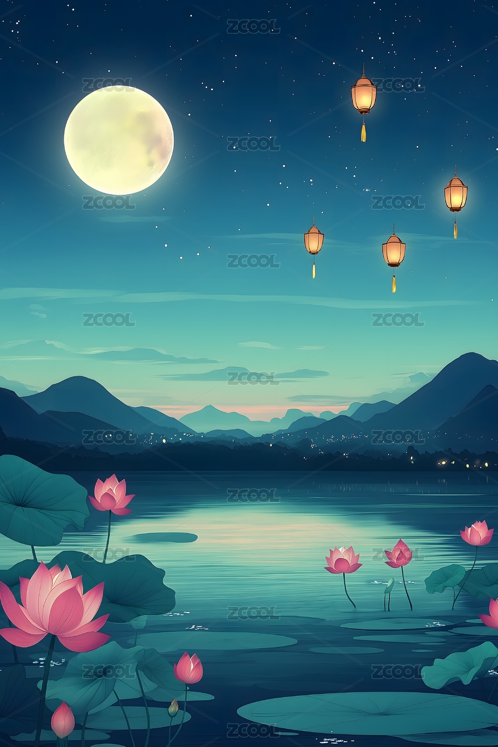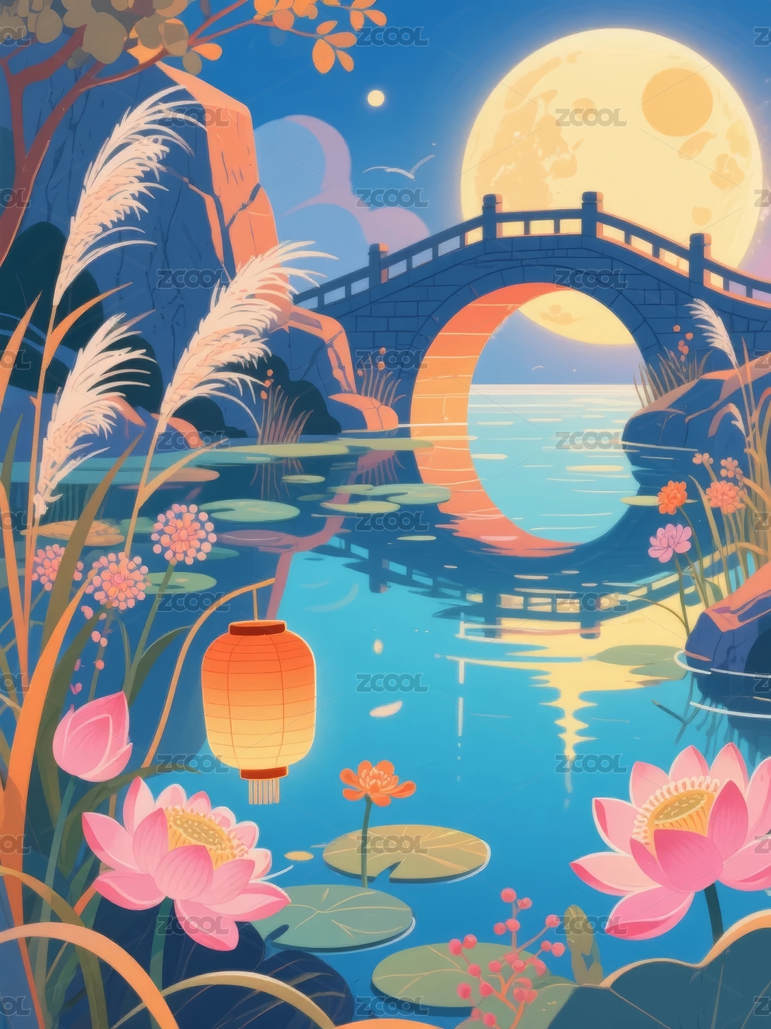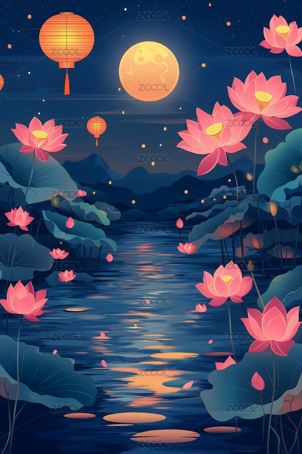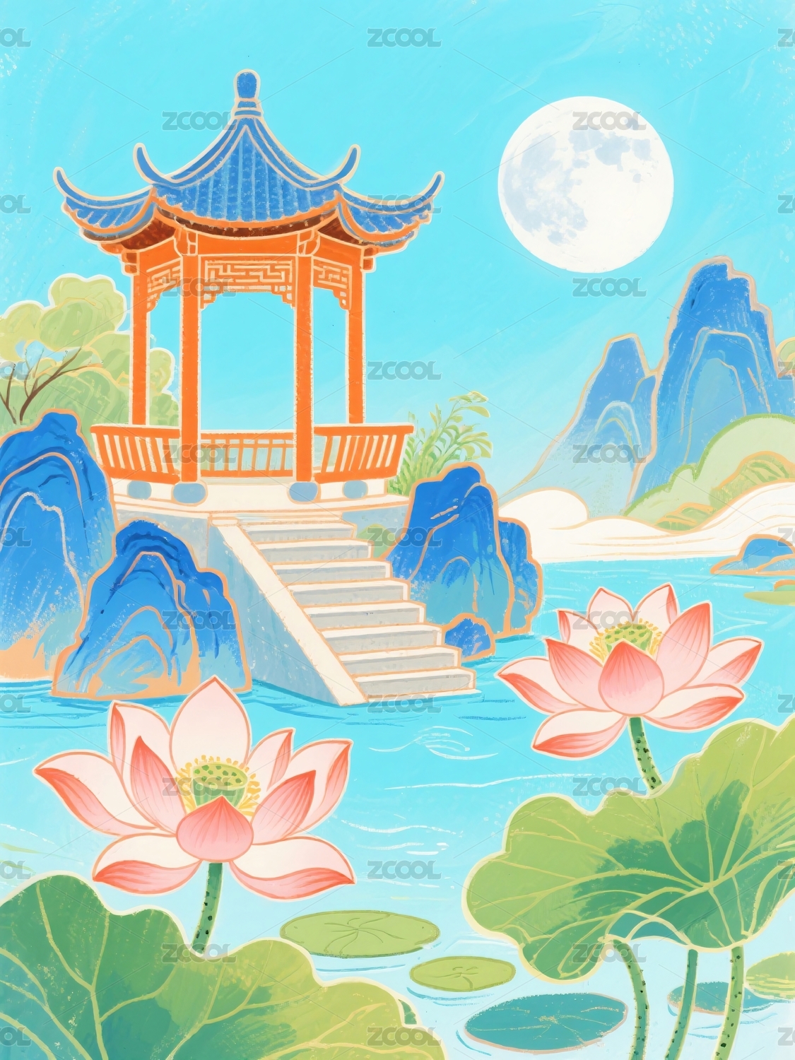 中秋节, 月亮, 烟花, 中国风, 荷花, 莲花, 粉色, 花瓣, 建筑, 亭子