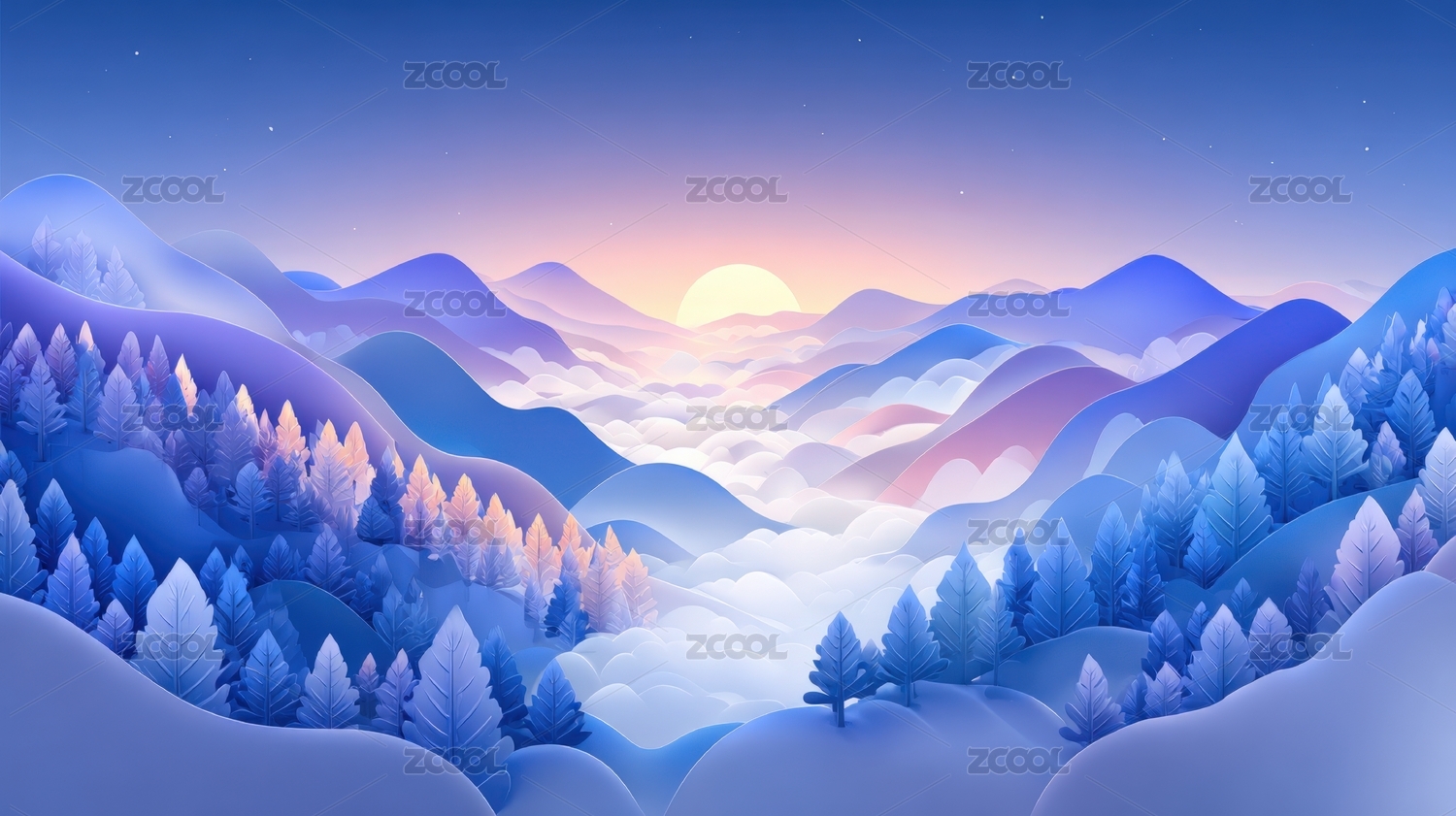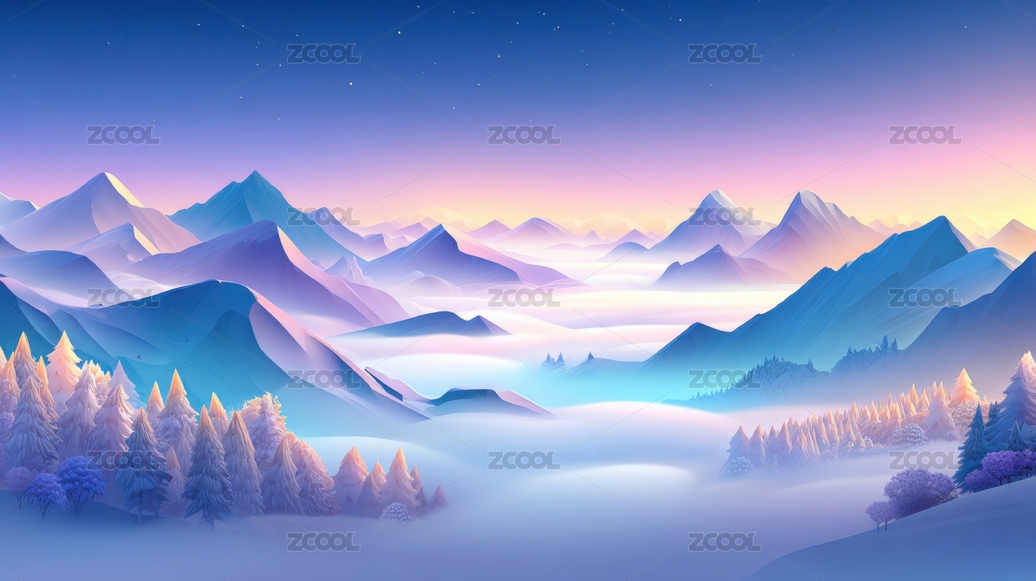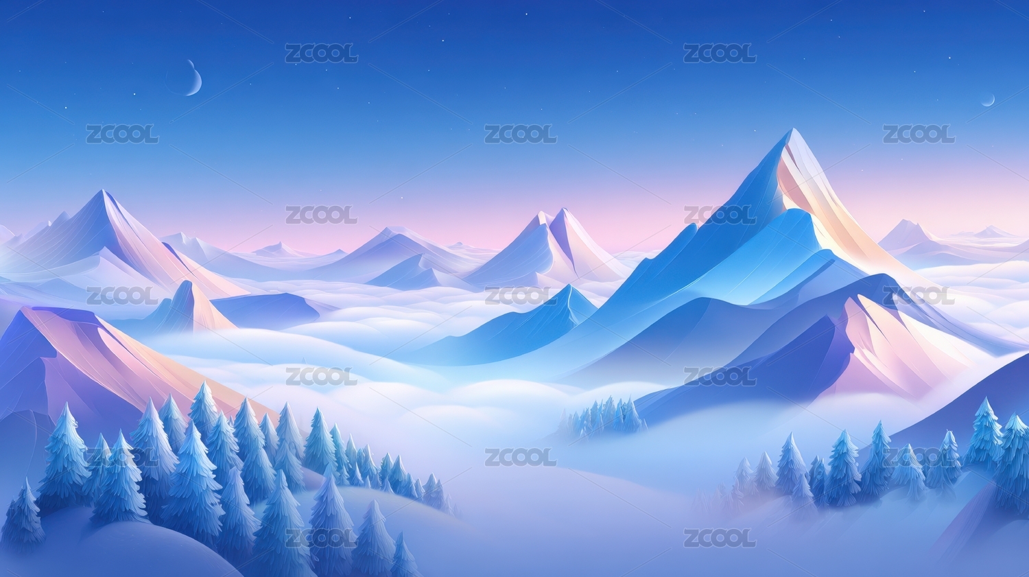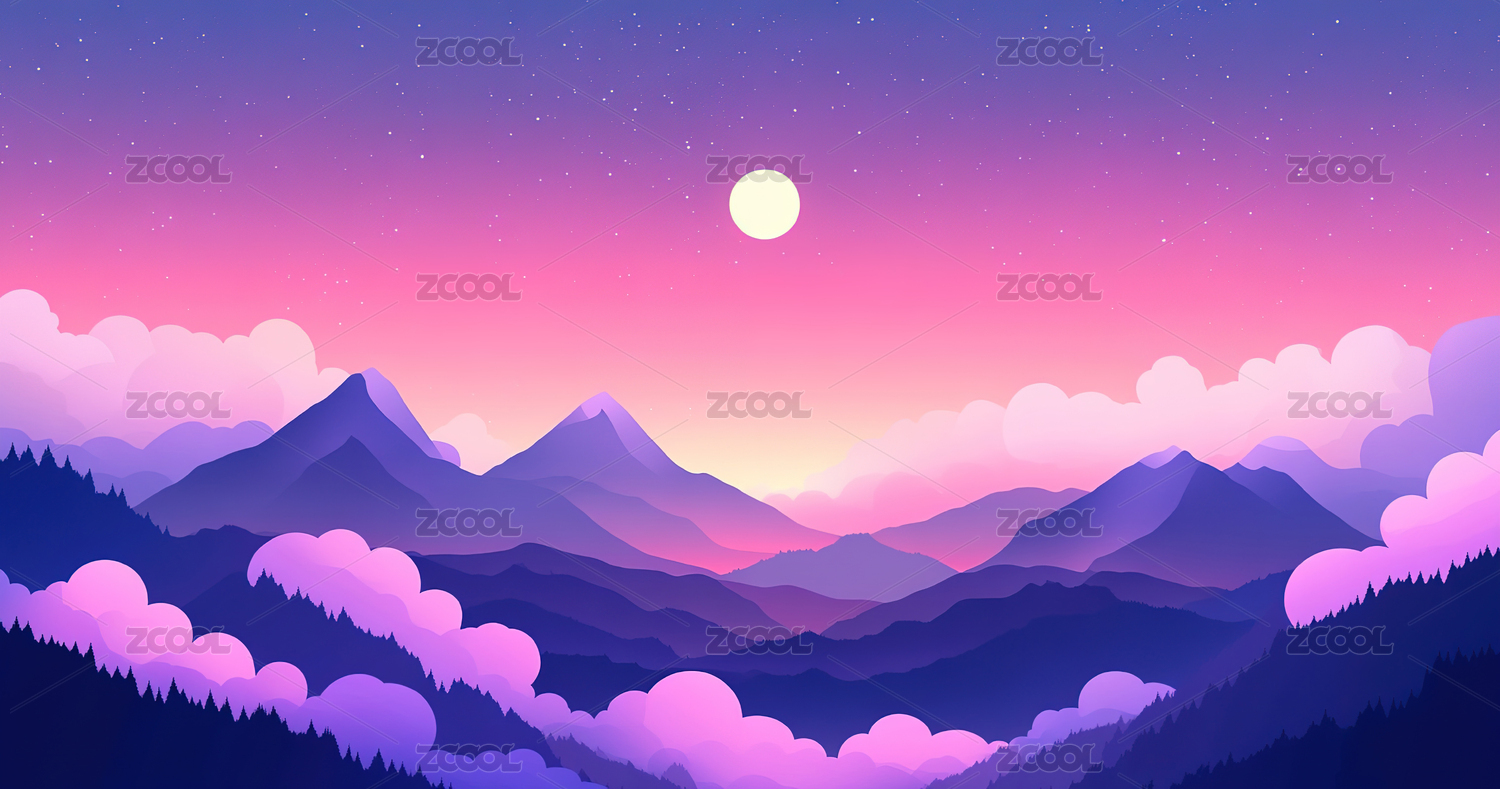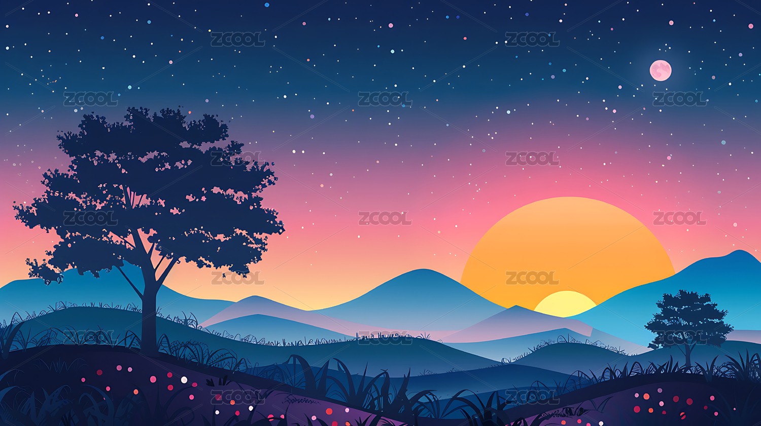 梦幻,星空,月亮,树木,景色,渐变,色彩,祥和,雪山,日出